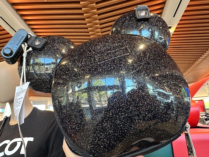 - The hardshell Mickey Mouse Loungefly bag features a glittery black plastic exterior molded to look like the iconic character’s face. Depending on how the light catches the bag, an iridescent effect will shimmer across the accessory.