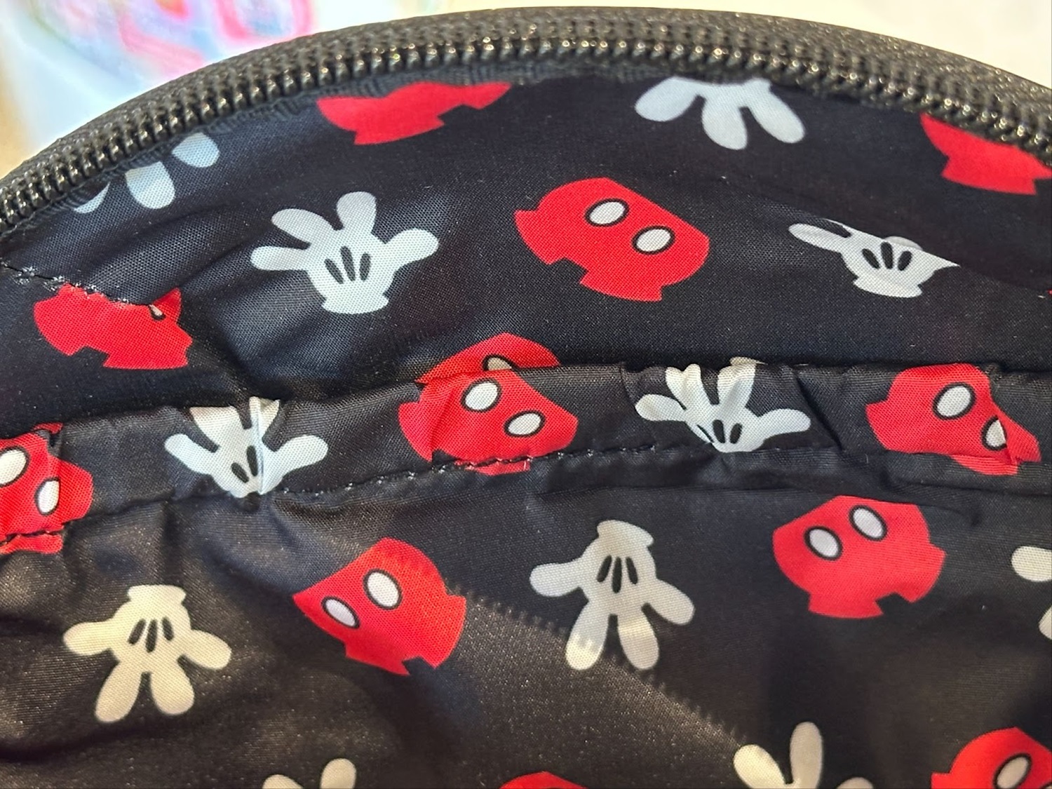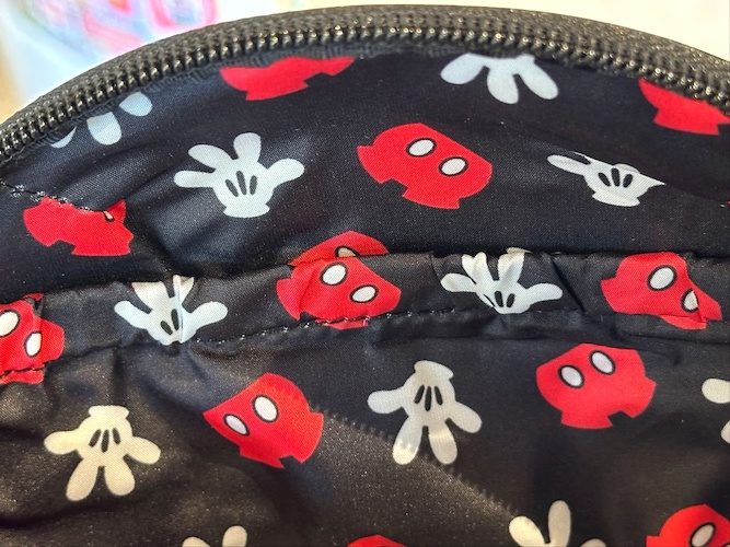 - The patterned cloth interior showcases Mickey’s iconic gloves and shorts. The crossbody also has an inside pocket for extra storage.