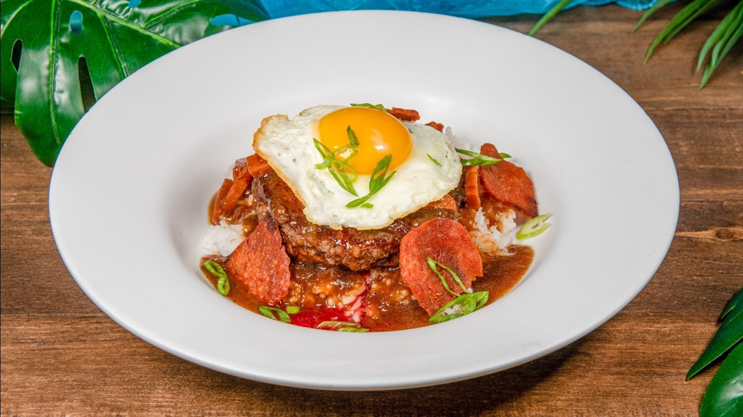 - Hamburger Steak & Eggs with spiced ham, fried rice, eggs, and mushroom gravy.