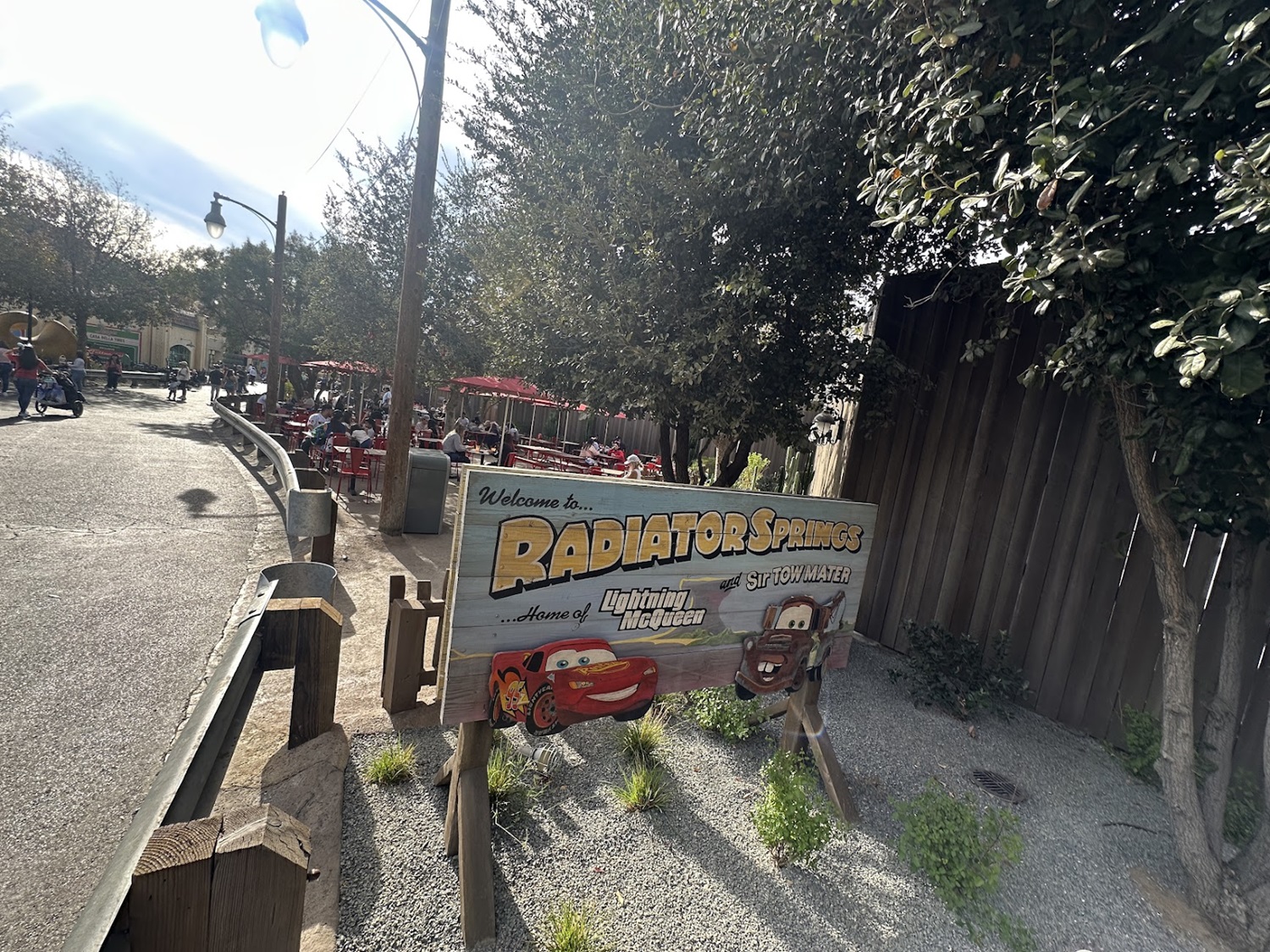 - On the side closest to Avengers Campus, a sign has been added at the entrance of the new eating area welcoming guests to Radiator Springs on one side and telling them to come back soon on the other.