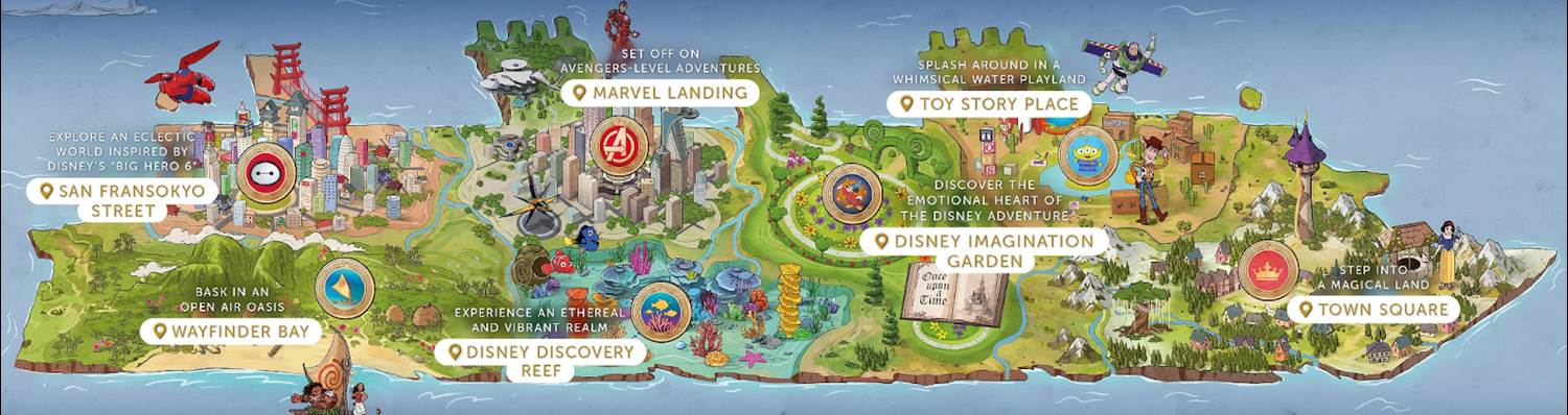 The spirit of discovery will inspire guests to chase the horizon, to see how far they can go, and to encounter surprising worlds beyond their own in the dynamic realms of Disney Discovery Reef, San Fransokyo Street and Wayfinder Bay.