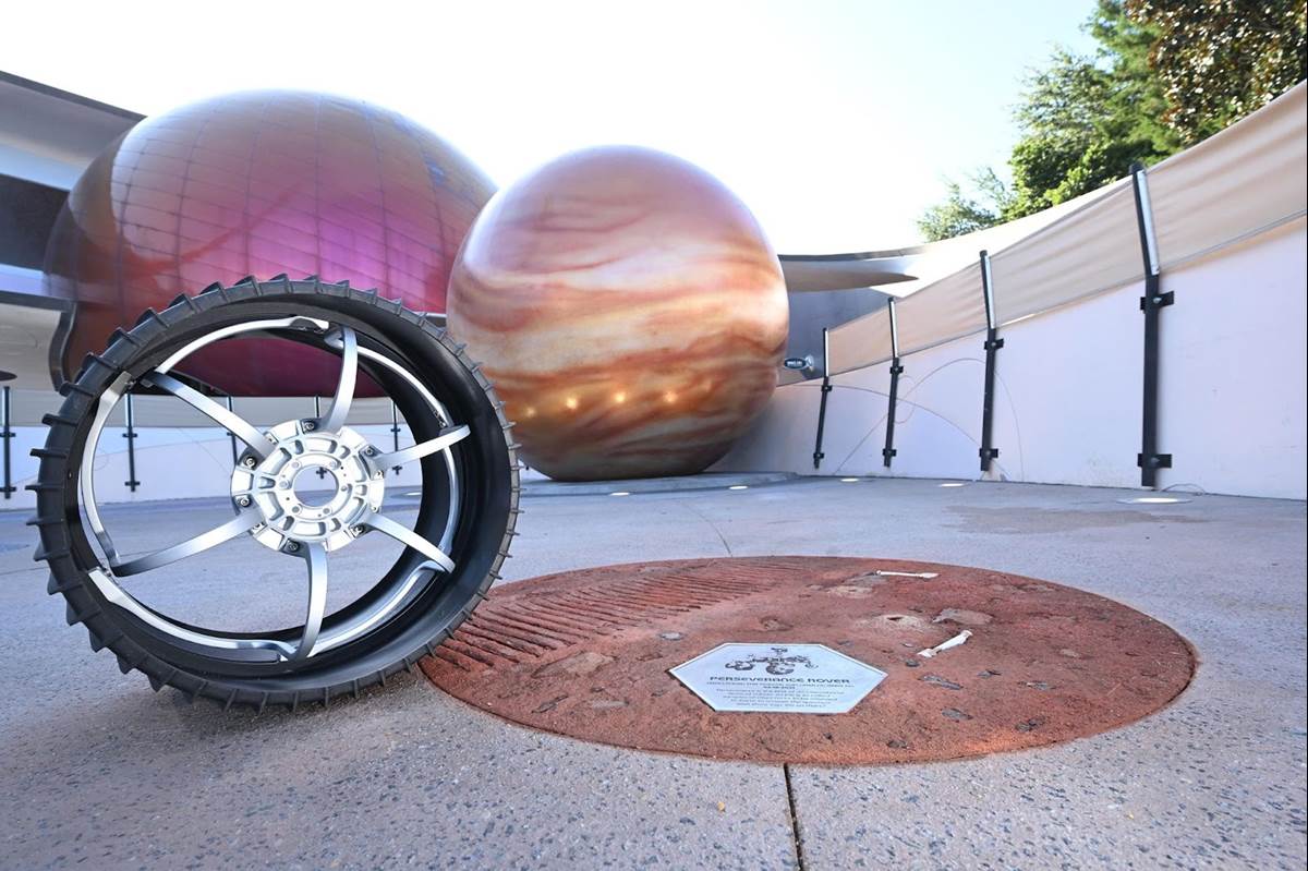 - A new display replicates the tread marks left by the Perseverance rover on the surface of Mars, using a borrowed prototype rover wheel.