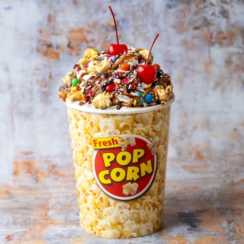 - At the Movies Ice Cream Bucket with caramel popcorn, TWIX cookie bar pieces, M&M’S Milk Chocolate Candies, SNICKERS bar pieces, chocolate and caramel Sauces, whipped cream, cherries, and sprinkles
