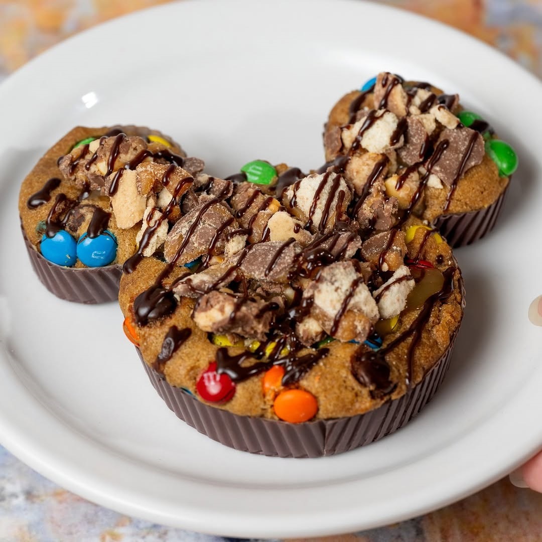 - Mickey Everything Chocolate Chip Cookie topped with M&M’S chocolate candies, TWIX cookie bar pieces, SNICKERS bar pieces, and caramel
