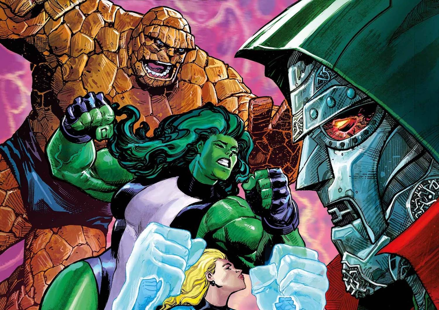 - Marvel’s description for Fantastic Four #29: “THE IMPOSSIBLE HAS HAPPENED! Doctor Doom has taken over the world! And the Fantastic Four are NOT going to let that stand. As Reed locks himself in his lab, trying to solve the Problem of Doom, Ben treats Sue to a trip to NYC with their mutual friend, Jen "She-Hulk" Walters, to help get her mind off of things. But tensions after vampires overran the world in their Blood Hunt remain, and when Ben, Sue and Jen find themselves on the wrong side of mob justice, they face a choice...and it's one they will not be able to take back!"