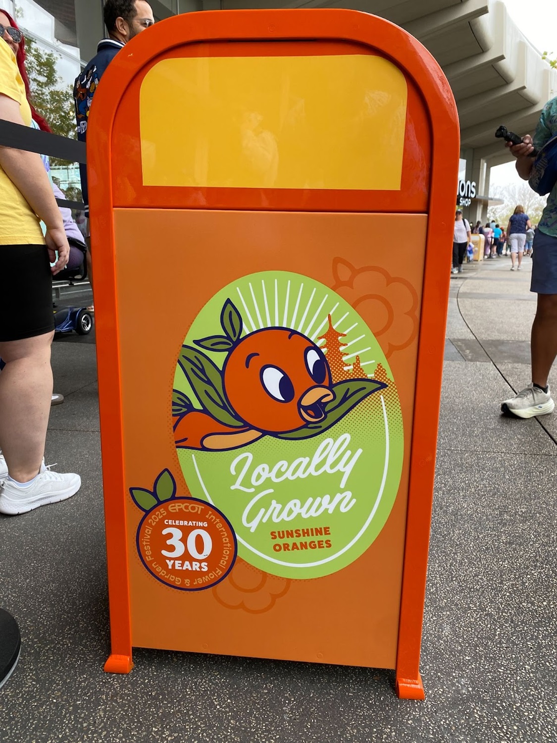 - The Orange Bird trash can features a vibrant orange design, displaying the Orange Bird and the phrase “Locally Grown Sunshine Oranges," along with “Celebrating 30 Years" and “2025 EPCOT International Flower & Garden Festival".