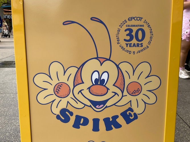 - On one side, Spike is depicted holding a pink and yellow flower over World Showcase, with the phrase “Spike the Bee Buzzin’ Around Since 1948" displayed above and the festival's logo in blue beneath it.