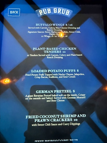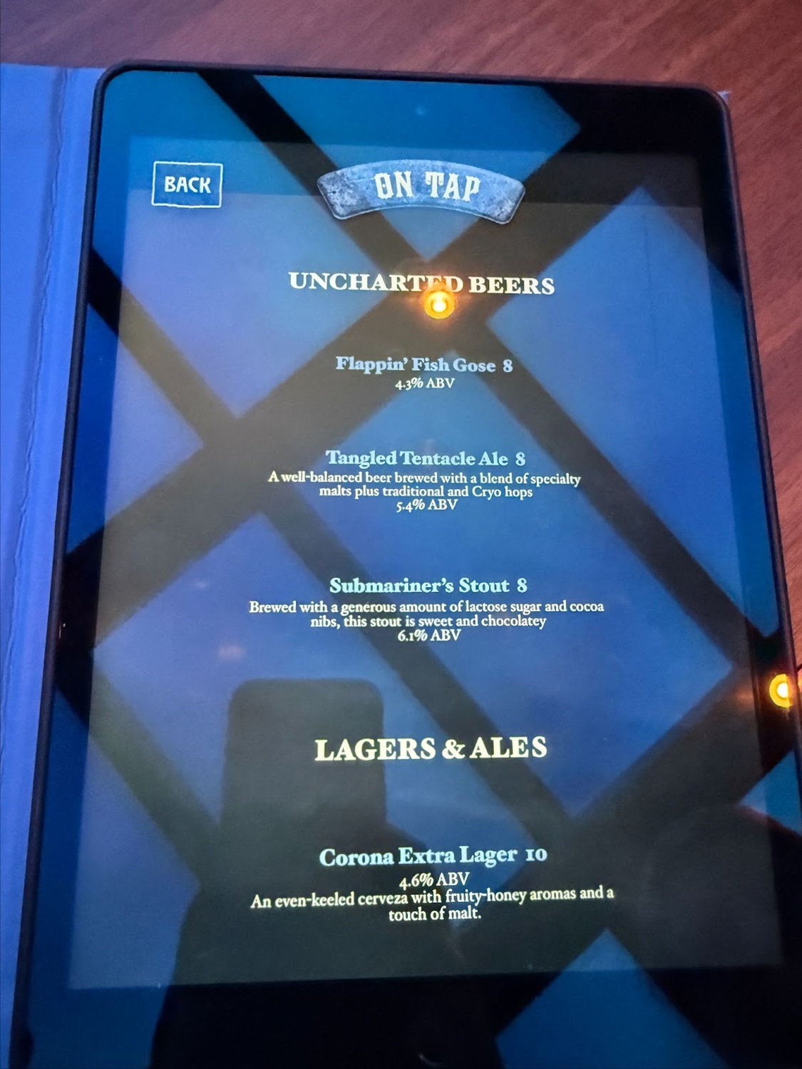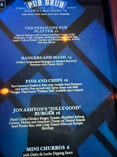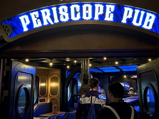 During your deepsea exploration, make sure you look around the inside of the pub, where you’ll find treasures and artifacts from Captain Nemo’s journeys. Make sure you look up through their “glass" ceiling to see the ocean above you. Guests will also be able to look through a real periscope to stay up to date on news and sports coverage across scientific-themed monitors.