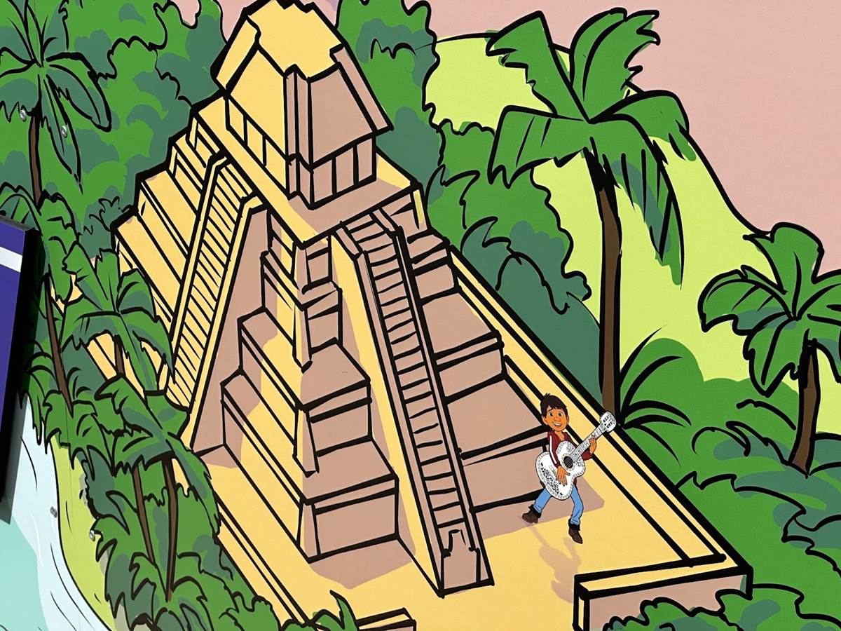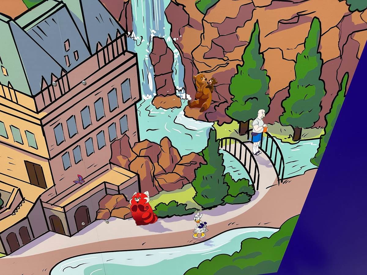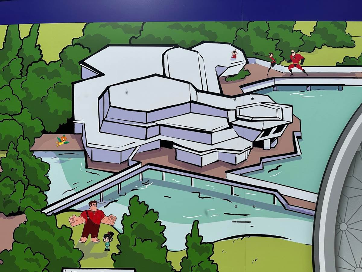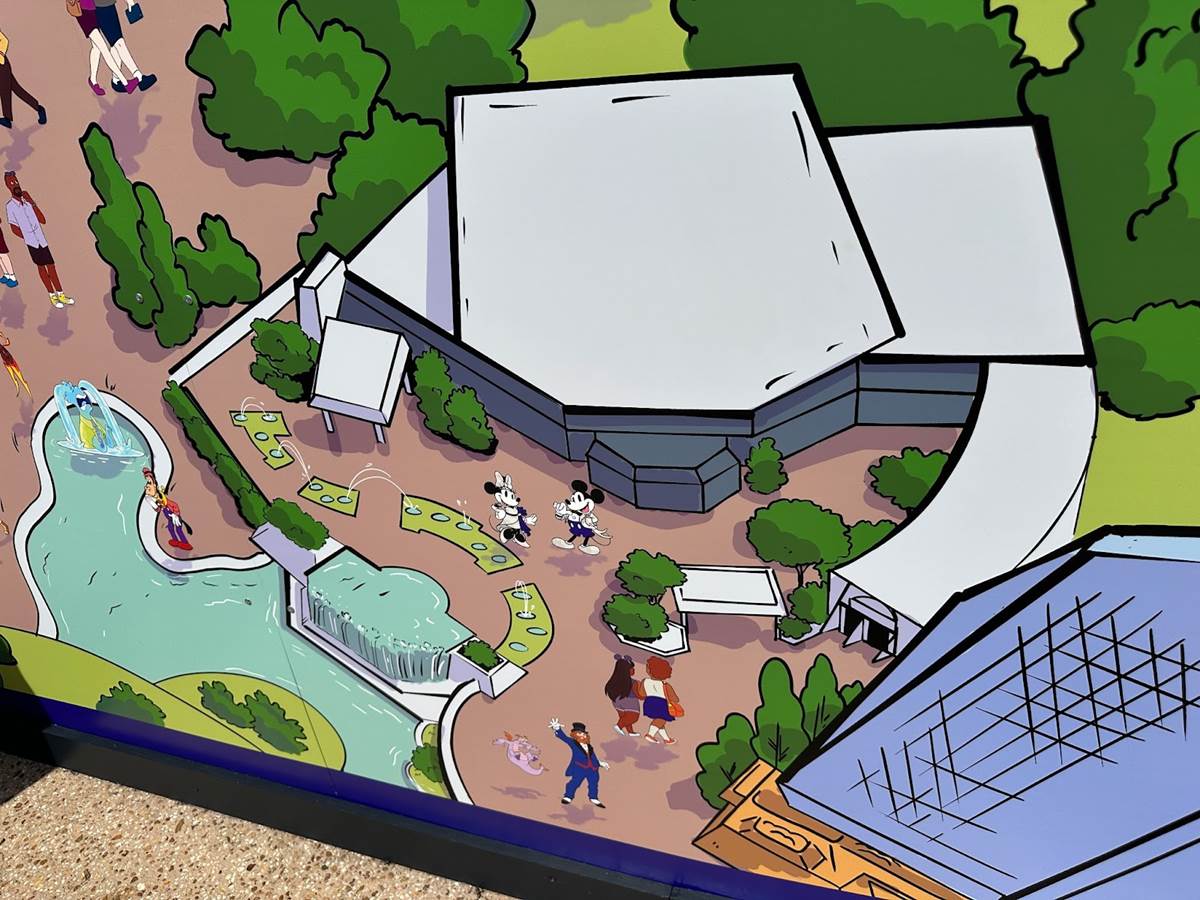 The mural is located on the path leading from Journey into Imagination to World Showcase, near the restrooms. It is designed as a map of EPCOT, with 100 different characters sprinkled throughout.