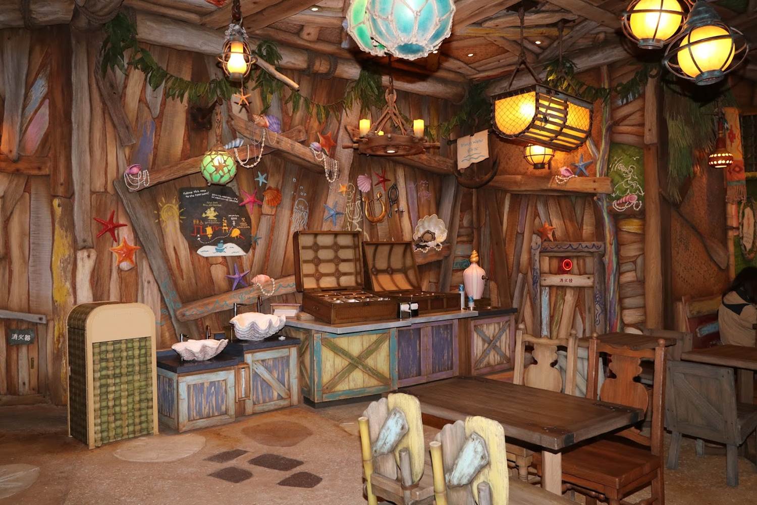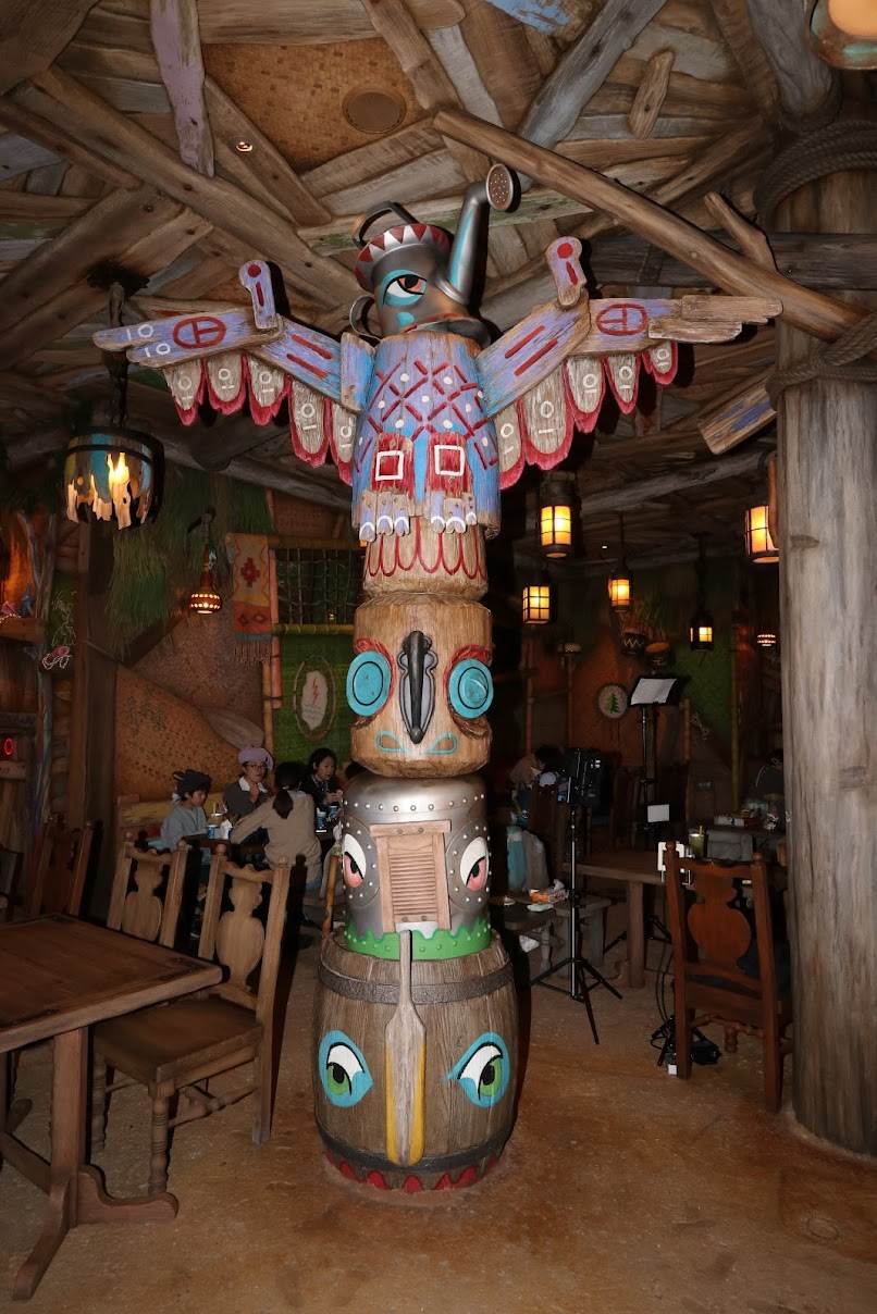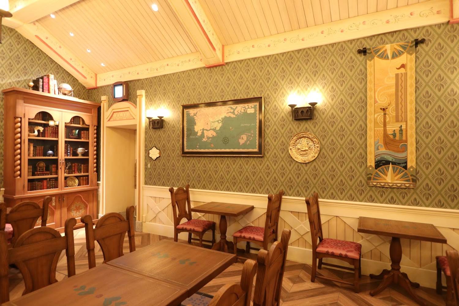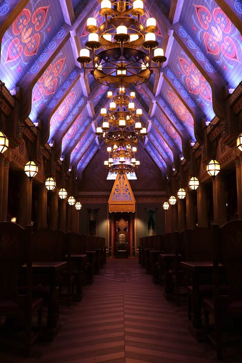 Inside the castle is the Royal Banquet Hall of Arendelle, the food and beverage location for the area. The dark woods add to the sense of pomp and circumstance for the dining location.