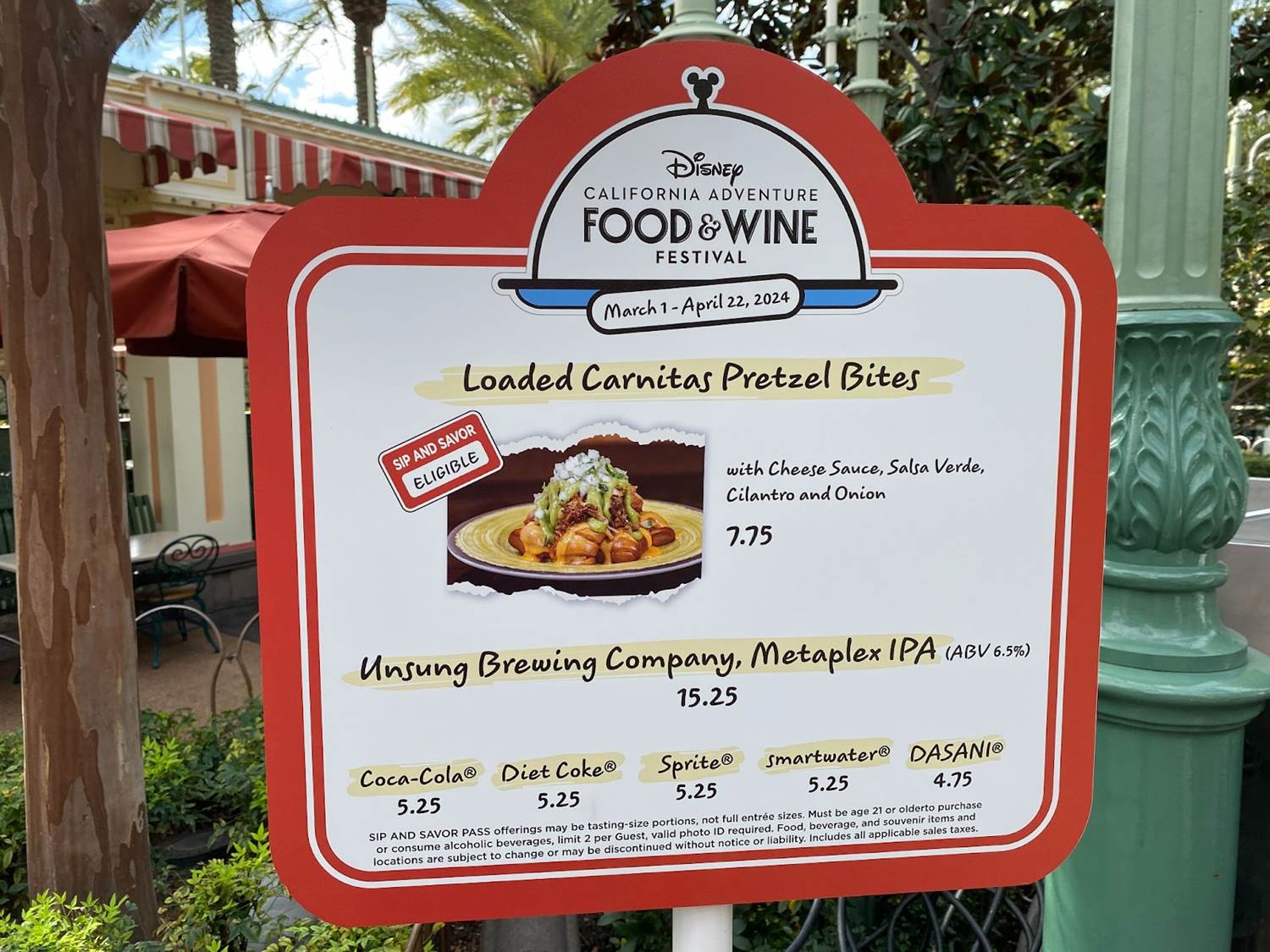 More special offerings can be found around the park, like these Loaded Carnitas Pretzel Bites at a cart or craft brews at the Festival Beer Garden.