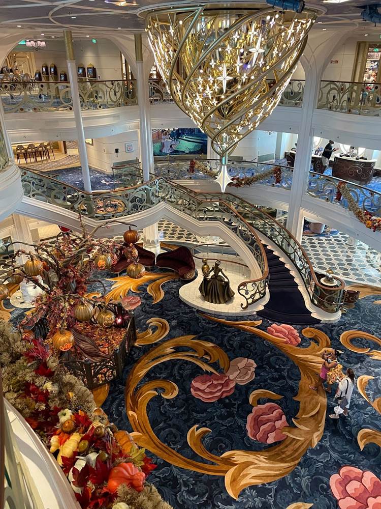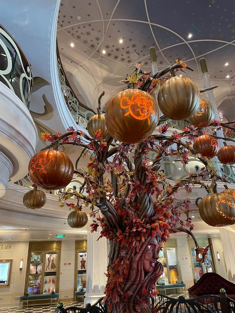 - With the Disney Wish’s first Halloween on the High Seas cruise of the year underway, the ship’s Grand Hall has been decorated with the familiar pumpkin tree and a ghoulish garland.