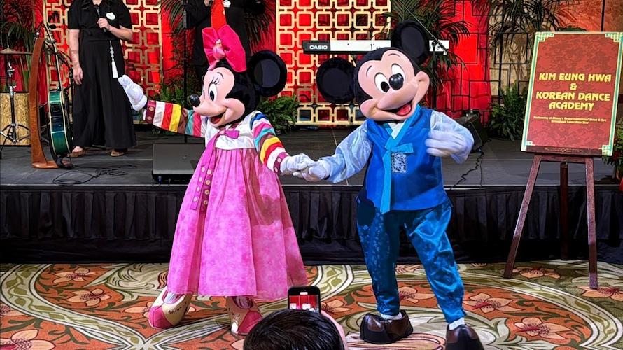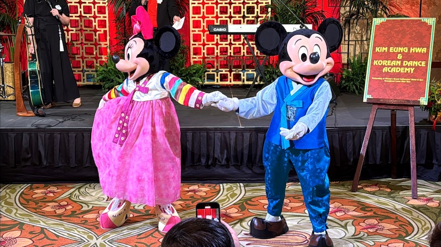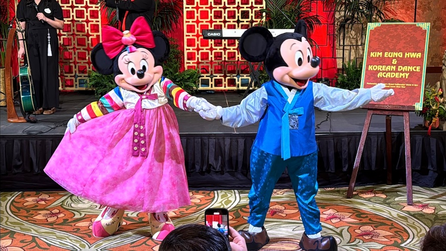 Today is the first day of California Adventure’s annual Lunar New Year celebration, and among the many entertainment offerings, special food and merchandise is the chance to see familiar characters in special Lunar New Year outfits. That includes Mickey and Minnie, who made their debut in their new outfits, inspired by Korean culture, at a media event today.