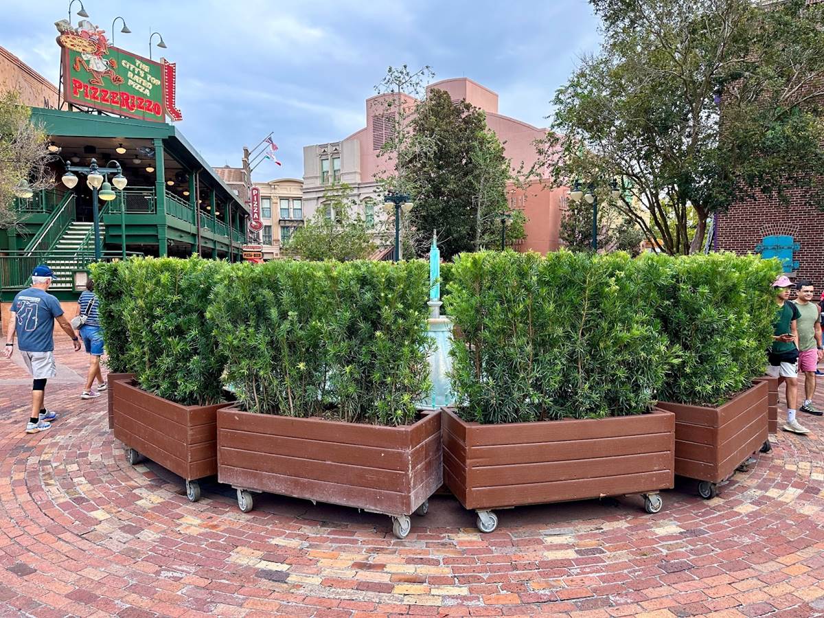 The iconic Miss Piggy fountain in front of Muppet*Vision 3D is currently blocked off by planters as it undergoes a refurbishment.