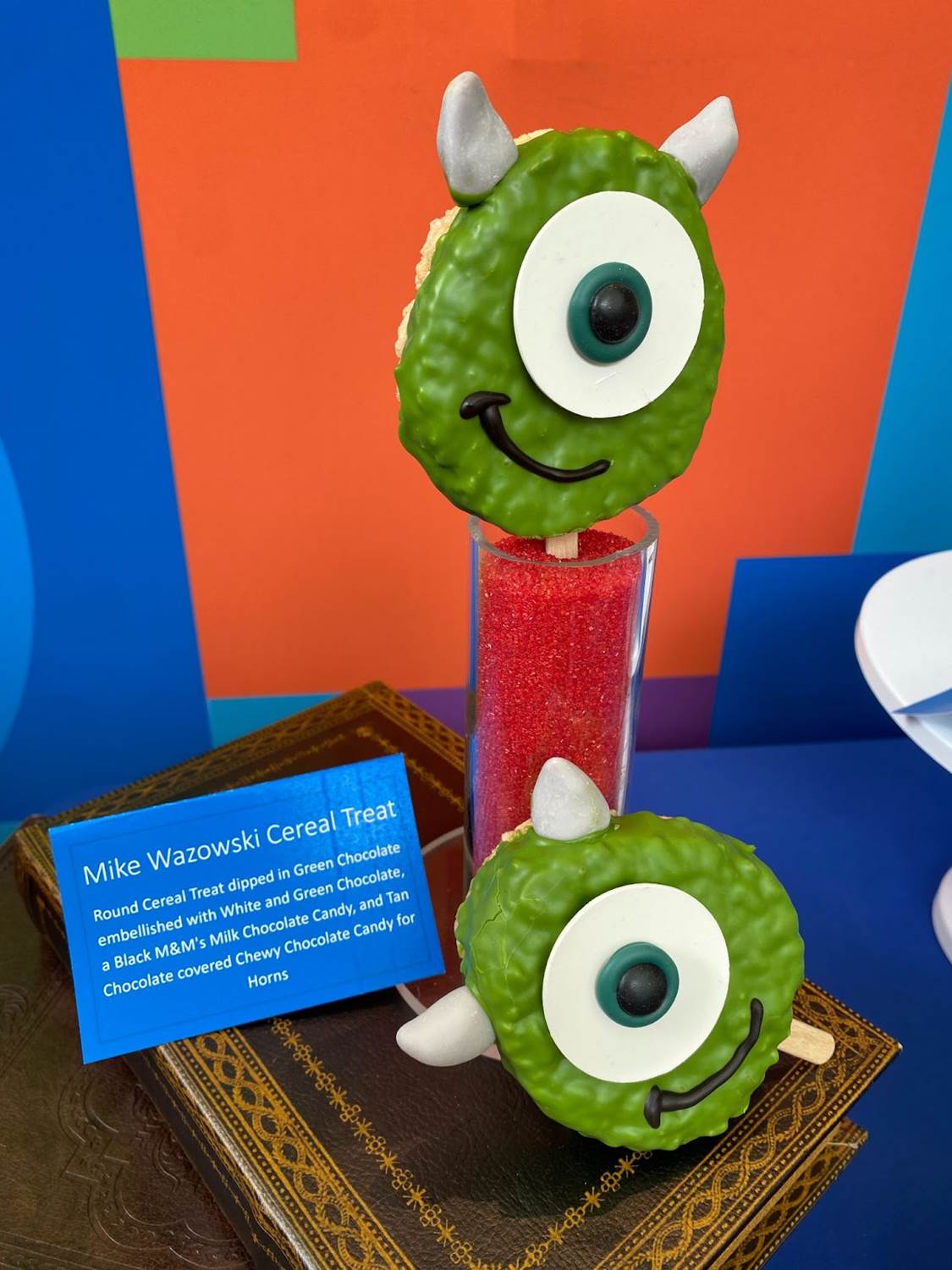 The Mike Wazowski Cereal Treat is decorated with green chocolate, a black M&M’s Milk Chocolate candy eyeball, and chocolate-covered chewy chocolate candy for horns. You’ll find him at numerous candy locations, including Bing Bong’s Sweet Stuff, Candy Palace and Candy Kitchen, and Trolley Treats.