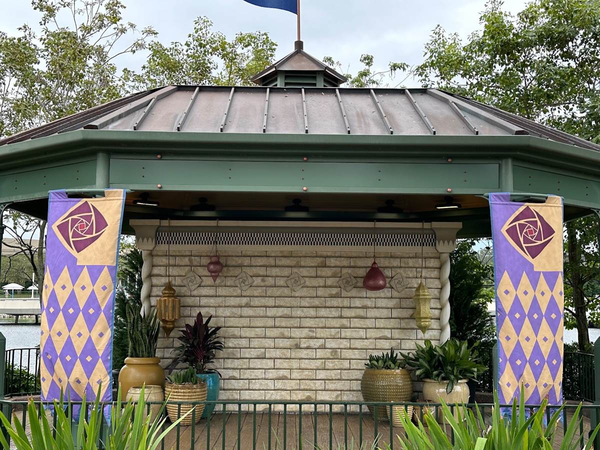 The gazebo has been decorated with some minimal items and banners from the Kingdom of Rosas.