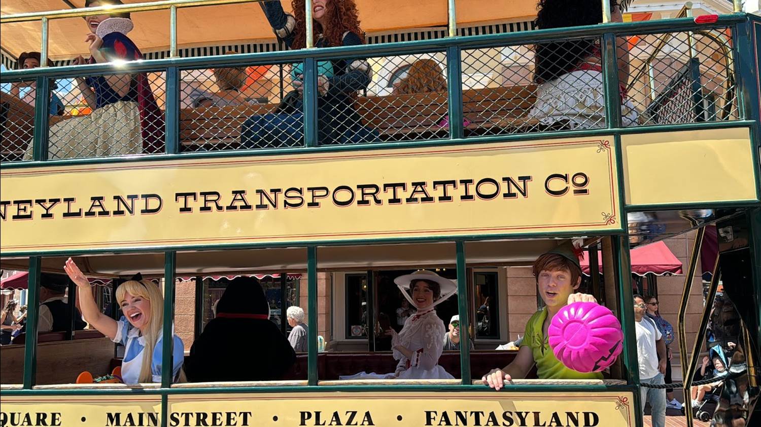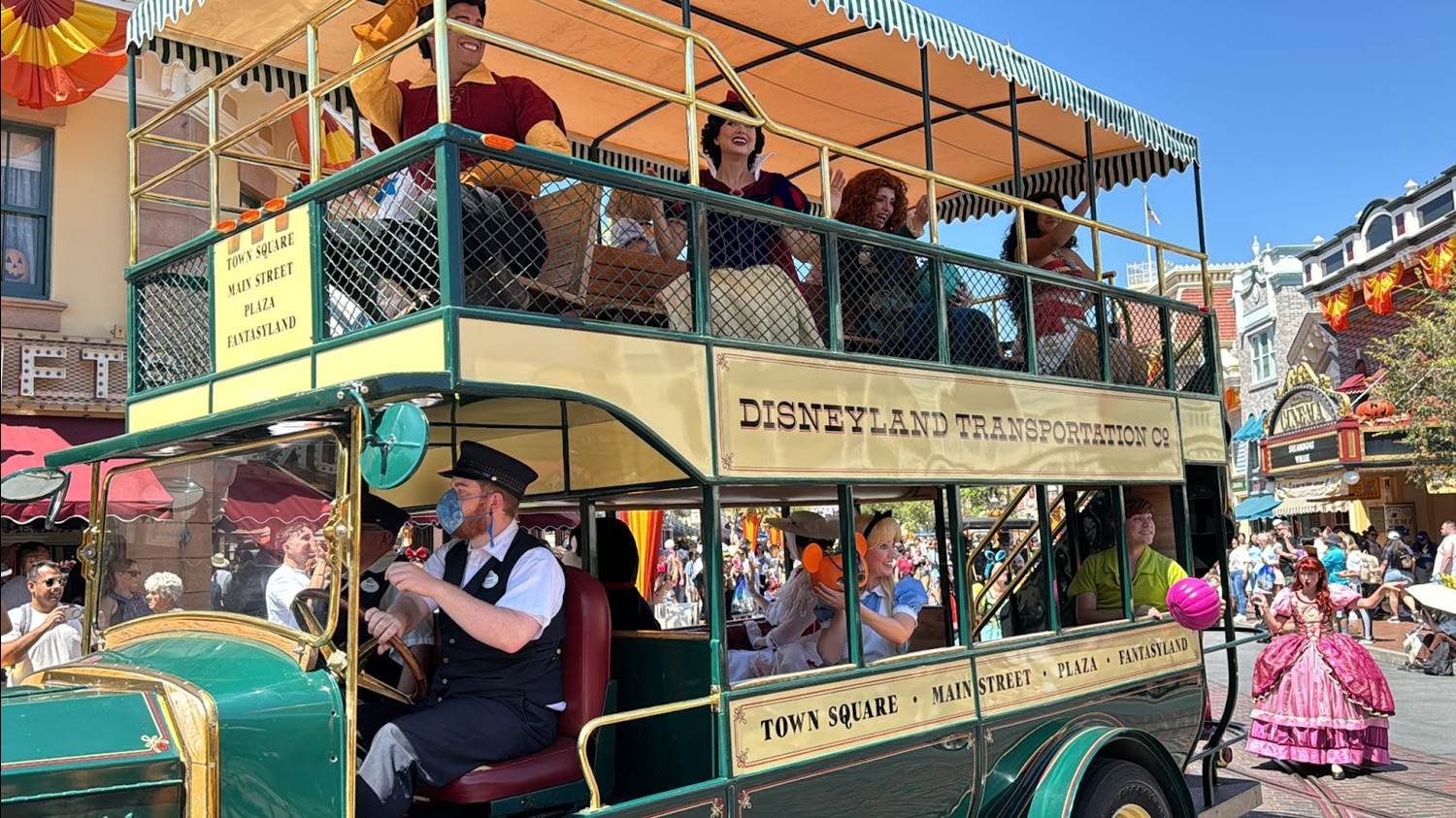 Disneyland’s double-decker Omnibus carries more characters with their trick-or-treat buckets. The upper deck features Belle, Gaston, Snow White, Merida, Moana, Aurora, and Cinderella.