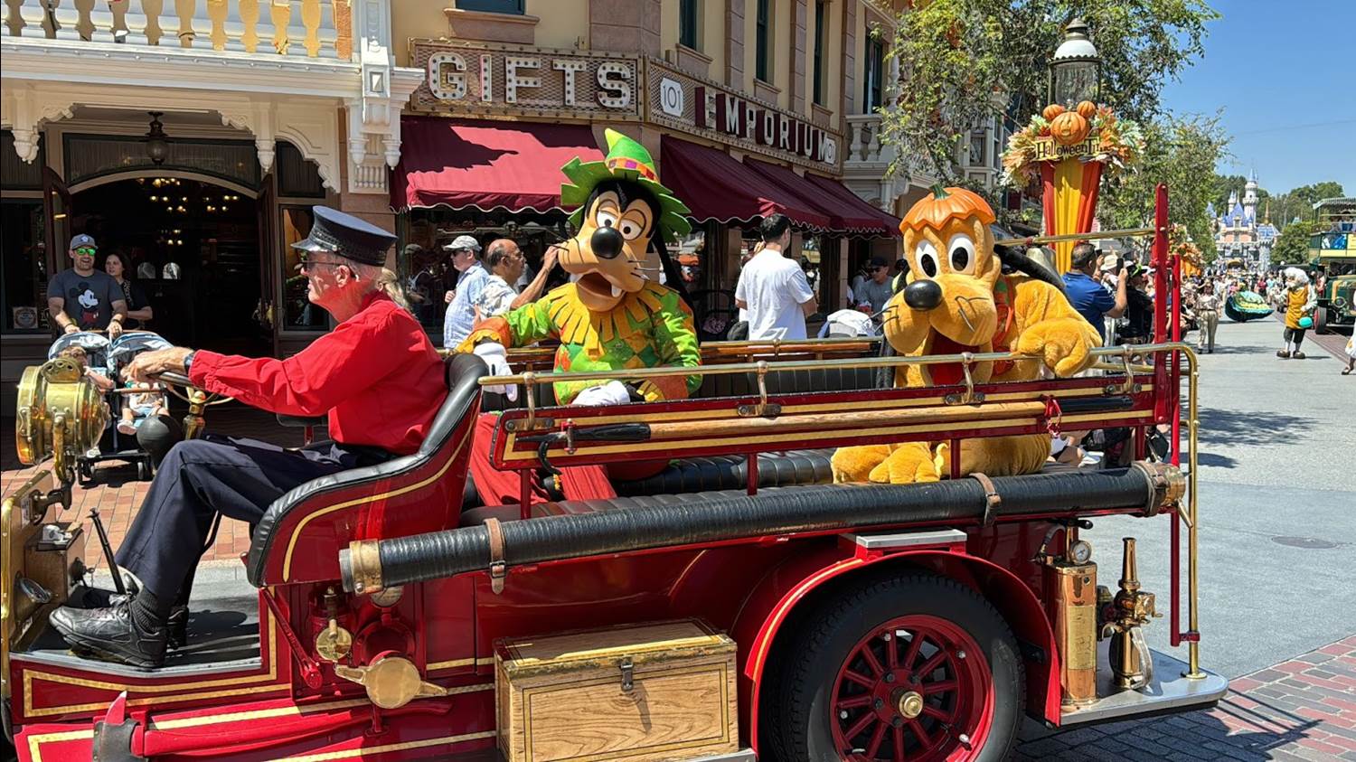 The cavalcade kicks off with Goofy (dressed as a scarecrow) and Pluto (with a smashed pumpkin top on his head) riding in the Disneyland Fire Engine.