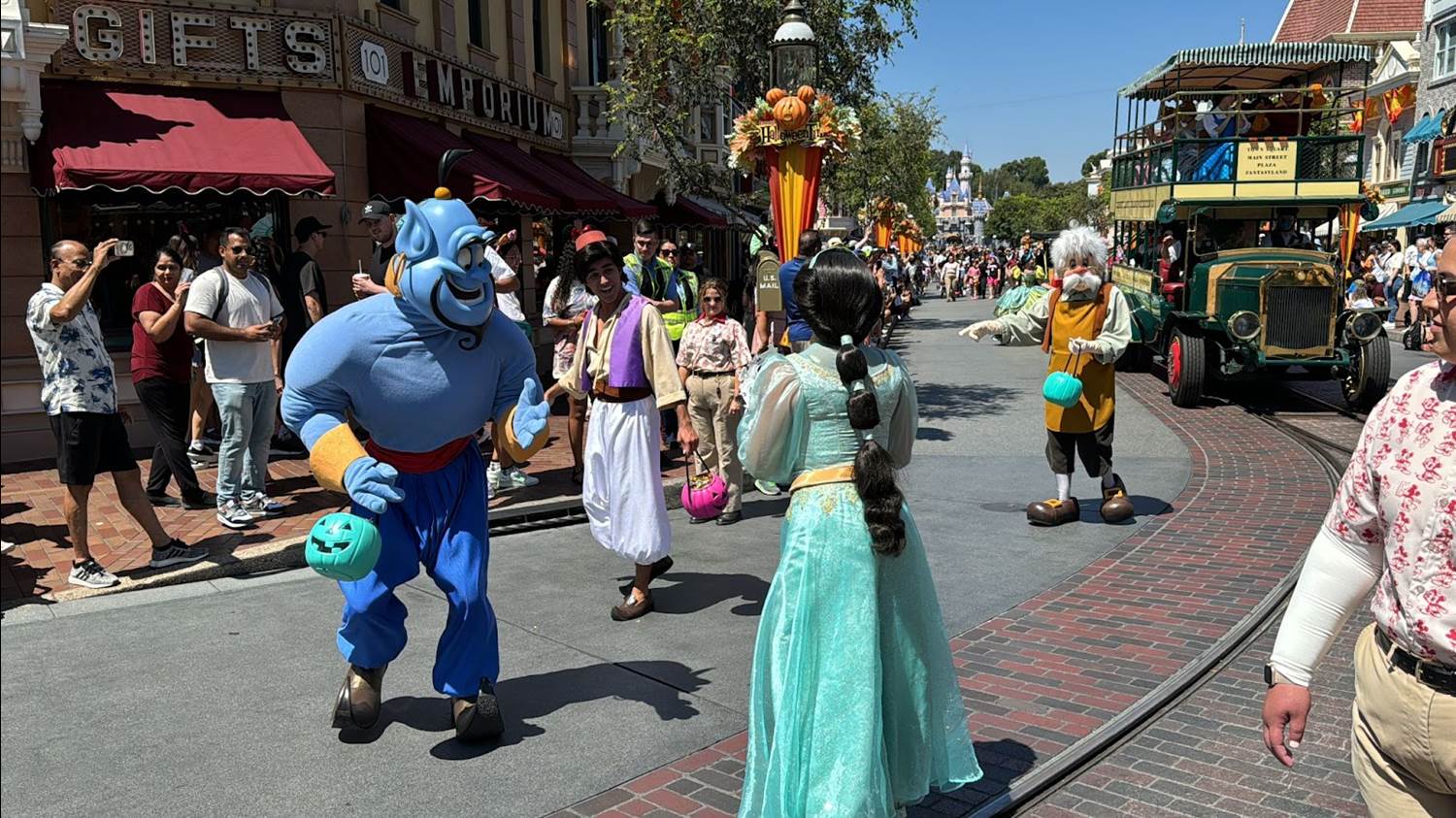 Trailing behind the float are a few trick-or-treaters on foot. From Aladdin, there’s the title character, Jasmine, and Genie.