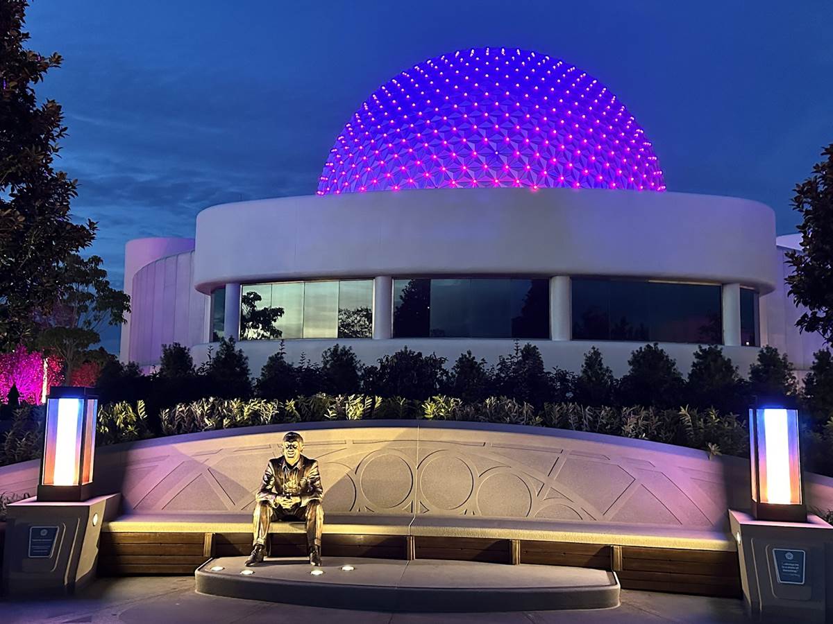 “Walt the Dreamer" is beautifully illuminated by the surrounding lights of World Celebration and Spaceship Earth.