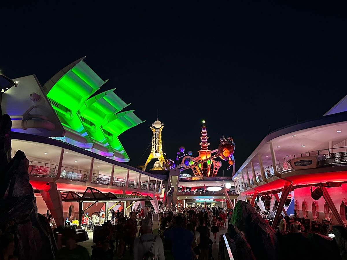 Speaking of Tomorrowland, the main entrance to the land is lit in bright green and red for the event.
