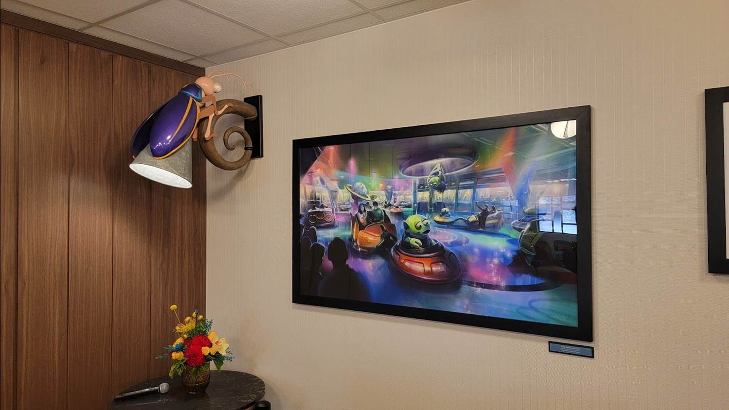 With that, Rebekah and the other reporters in attendance were introduced to a few of the creatives who were involved with the design of the hotel: Kirstin Makela, Art Director for Walt Disney Imagineering, Tasha Sounart, Theme Park Creative Director for Pixar Animation Studios, Joey Caporaso, Senior Producer for Walt Disney Imagineering, and Krista Sheffler, Senior Theme Park Producer for Pixar Animation Studios. These creative talents posed in the Creators Club with some of their work from Disney Parks around the world.