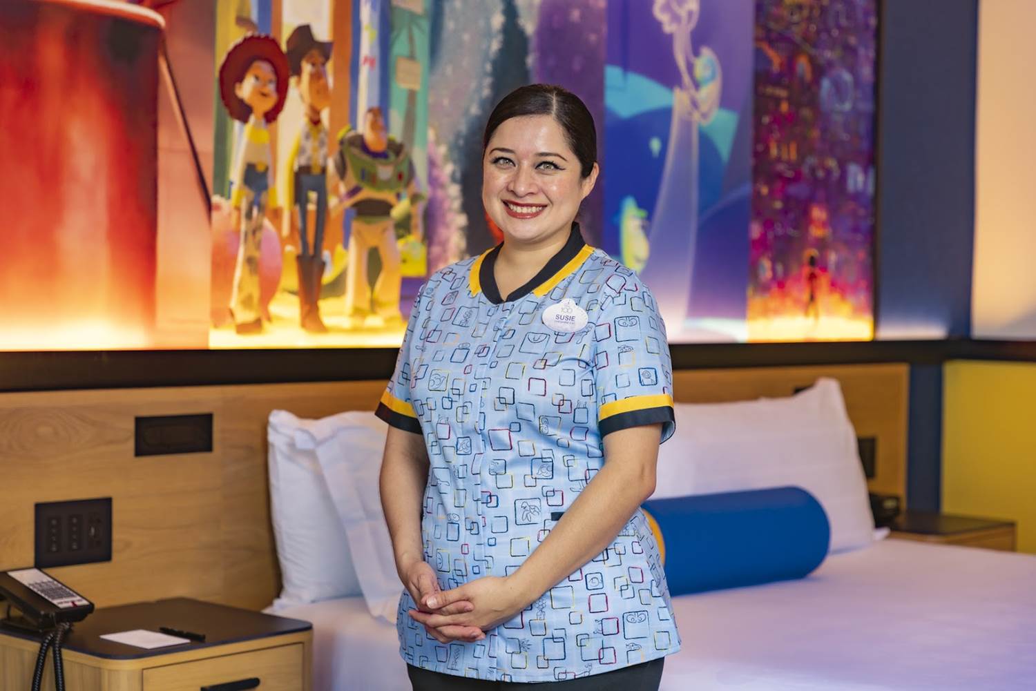 With the Pixar Place Hotel being the first hotel fully themed to Pixar in the country, the cast are proud to wear the costumes that were designed by Walt Disney Imagineering hand in hand with Pixar Animation Studios, and the costuming department at the Disneyland Resort. Susanna Mercado, a room attendant at the Pixar Place Hotel called wearing the costumes a “huge privilege," saying that “From the start of it all, Toy Story to Elemental - to bring those characters to life, across the property from the lobby to the guest rooms – and even to our costumes, to show the variety of characters from favorite Pixar films is incredible."