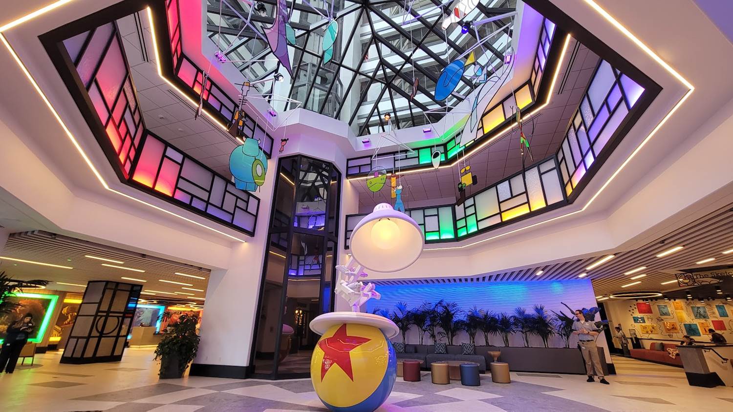 This idea continues right into the lobby, where guests will be surrounded by unique art and displays from the various films in the Pixar Animation Studios catalog. At the front desk, guests will be greeted by Cast Members wearing costumes that feature strips of color, with the idea that the color is what helps the film come to life from start to finish, much like how guests rely on the front desk cast to interact throughout their stay, from the first greeting to the final farewell after check-out.