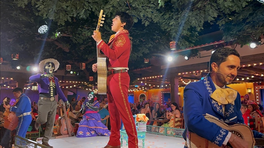 Plaza de Coco is the first theatrical dining experience themed to the Pixar Animation Studios film, Coco. This theater-in-the-round entertainment venue features dining tables surrounding a central stage, with performances and show effects that spread throughout the room.