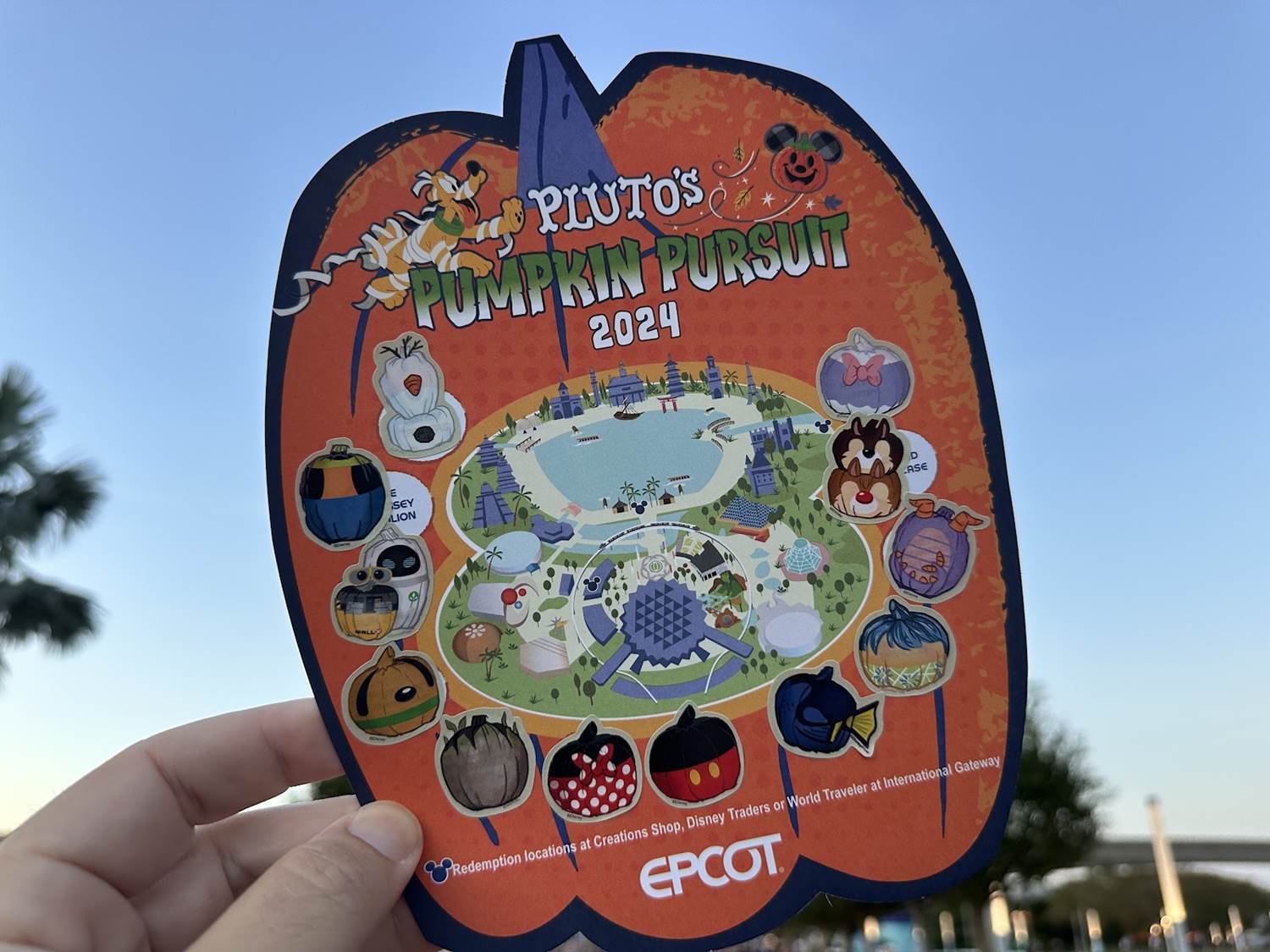 As you can see in the photos throughout the page, the pumpkins are hidden quite literally throughout the park. Some are in World Showcase, some are in World Celebration, and so on and so forth. As guests find them, the affix a corresponding sticker to their card.