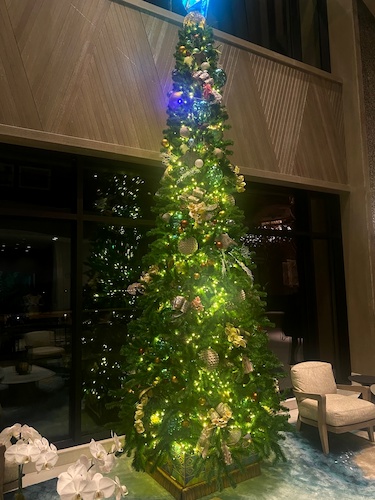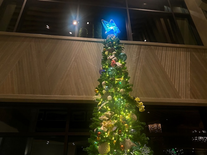 A small Christmas tree (at least by Walt Disney World hotel lobby standards) can be found off to the left of the lobby across from the restrooms.