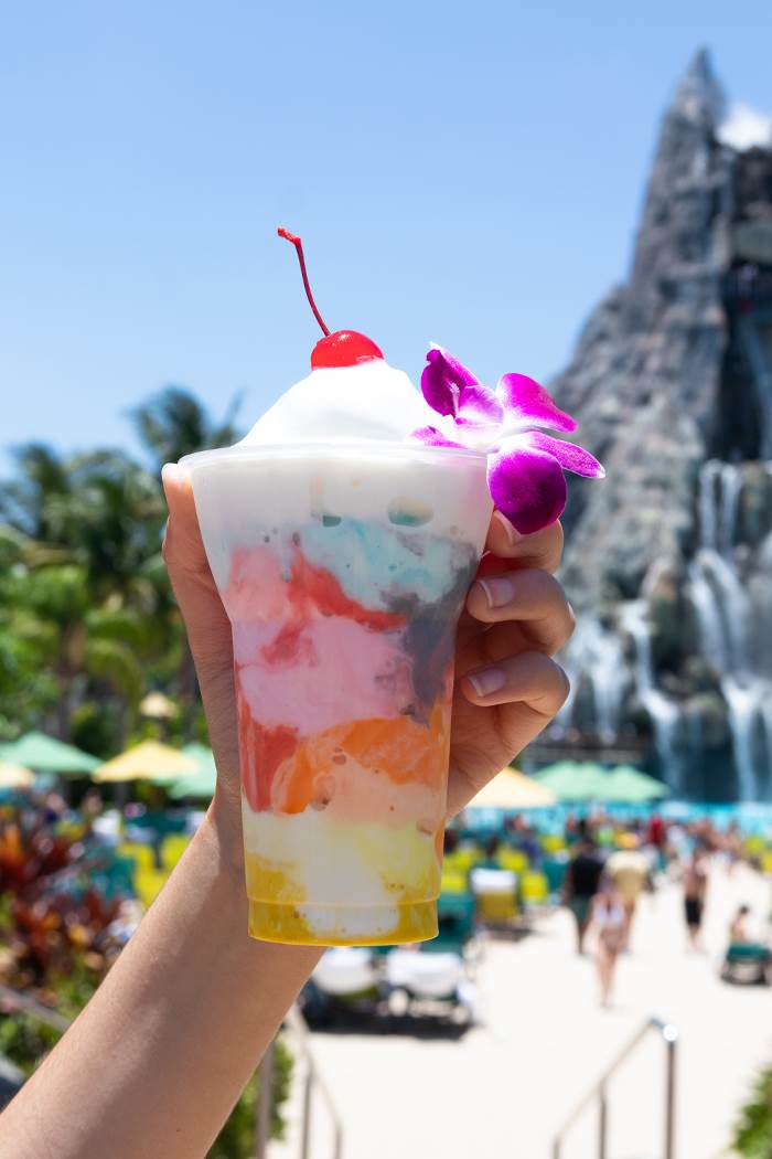 - Pride Sundae at Universal Volcano Bay – layered with banana, orange, blue raspberry and strawberry and topped with rainbow sprinkles, an edible orchid and a cherry