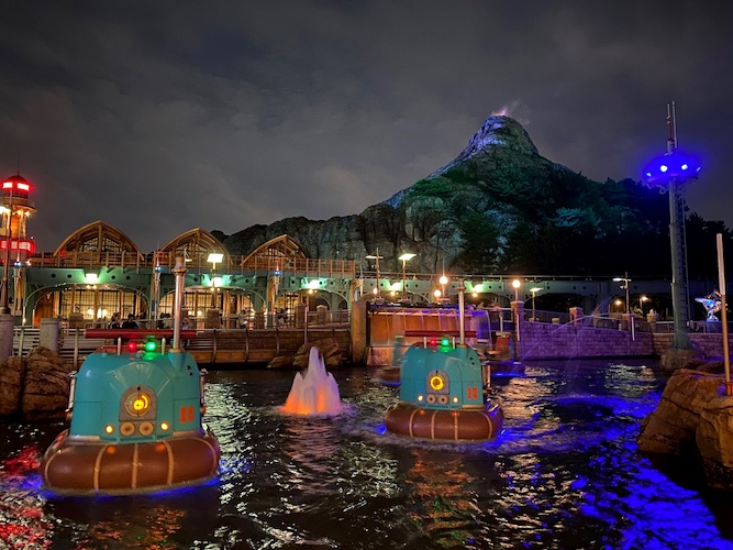 Flounder’s Flying Fish Coaster is similar to Gadget’s Go-Coaster at the neighboring Tokyo Disneyland, but does offer up a slightly different layout and experience. The attraction is cleverly set down into a lowered area, making it appear even smaller than it actually is – making it a great first-time coaster experience for the little ones.