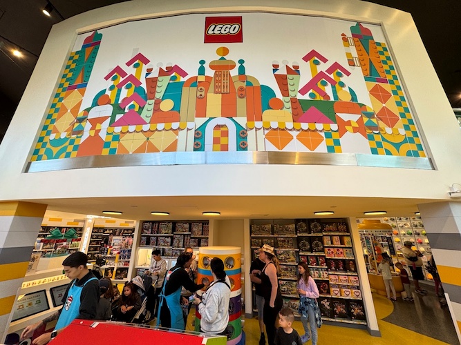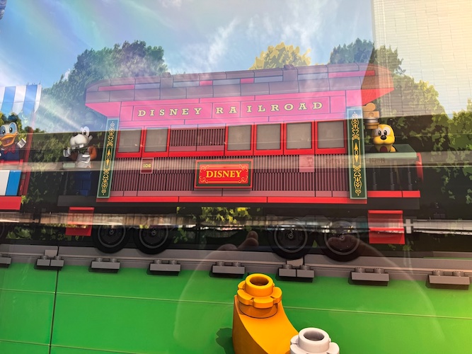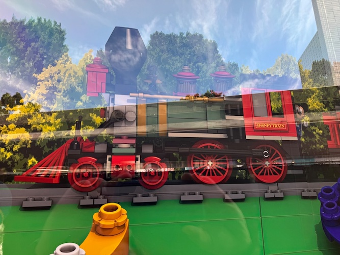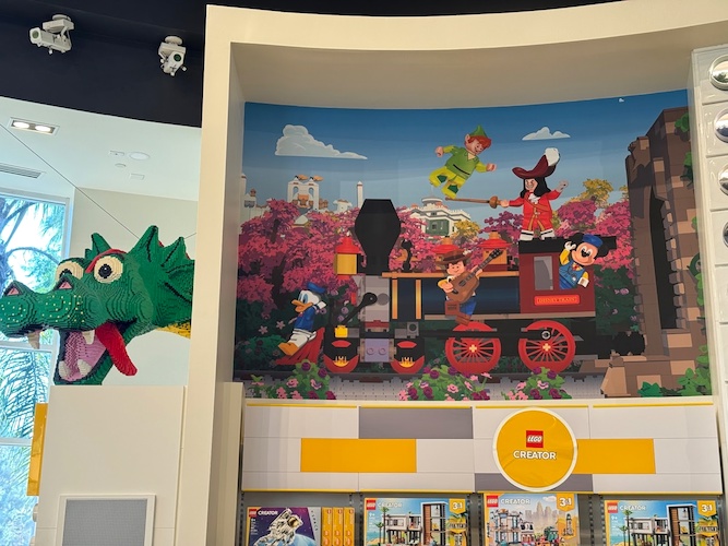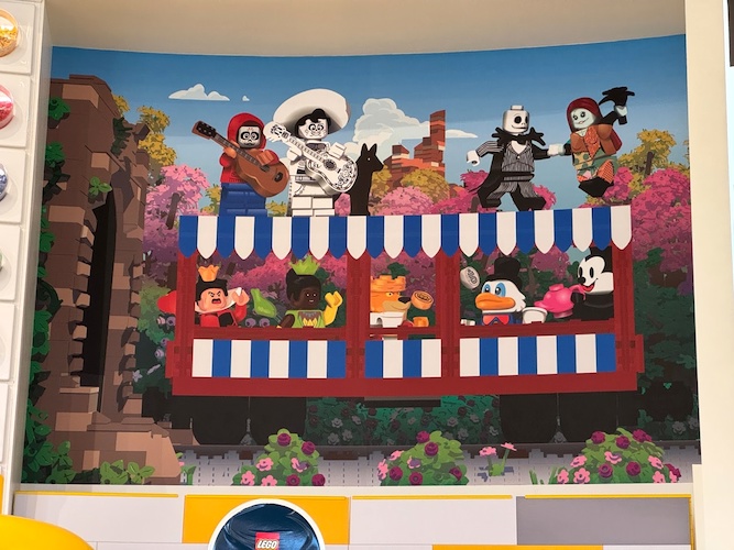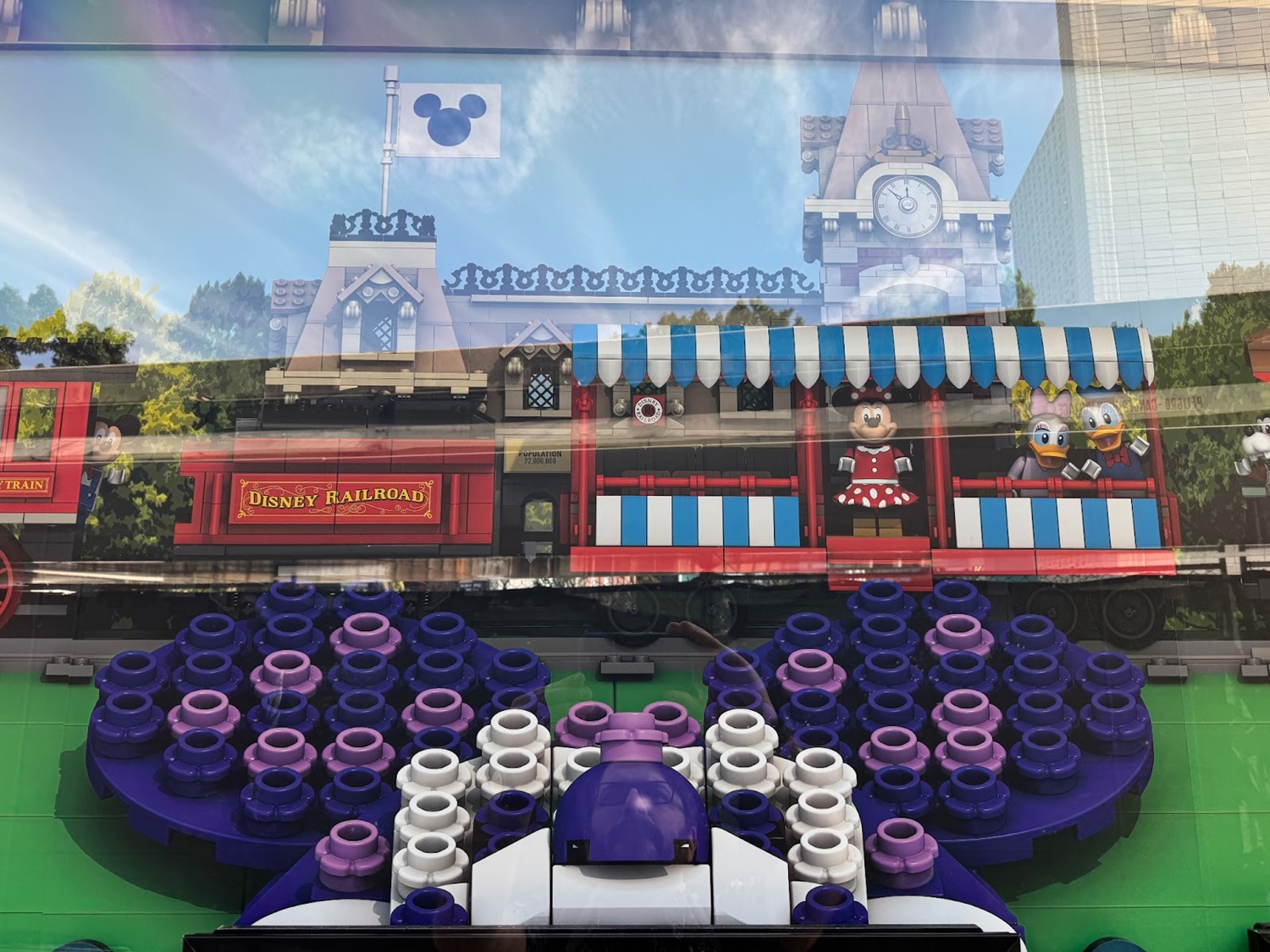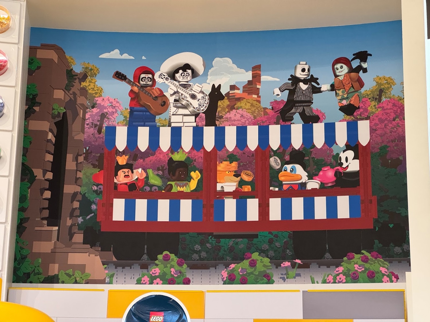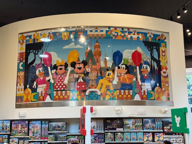 Inside the store, new murals have been installed, featuring Disney characters such as Sorcerer Mickey, plus a slew of other characters riding on a LEGO version of the Disneyland Railroad.