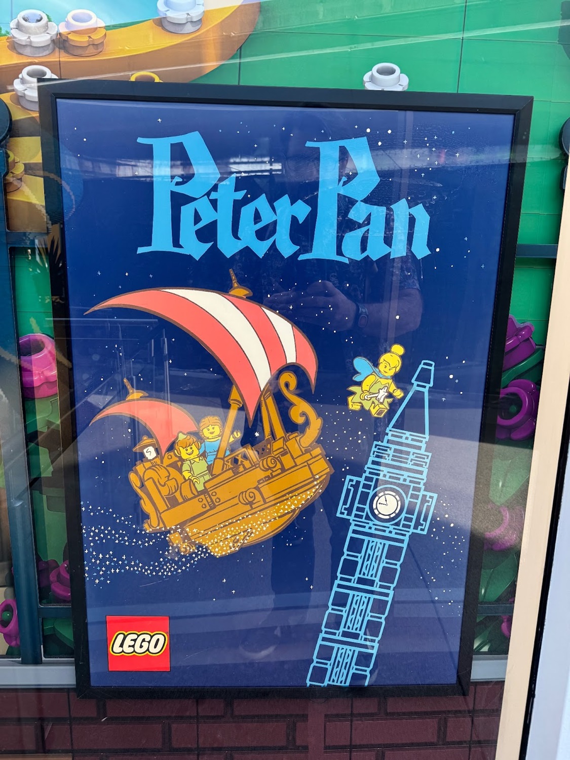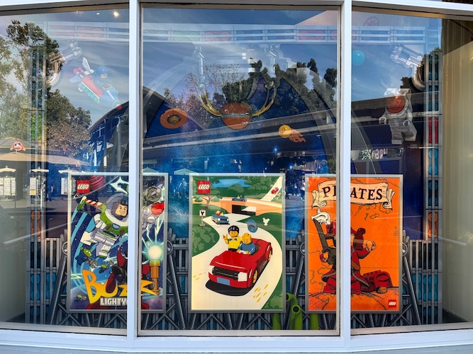 Outside the store, the immediate highlight are LEGO versions of some classic Disneyland attraction posters. The first window display features LEGO versions of the posters for The Haunted Mansion, Indiana Jones Adventure and Peter Pan’s Flight.