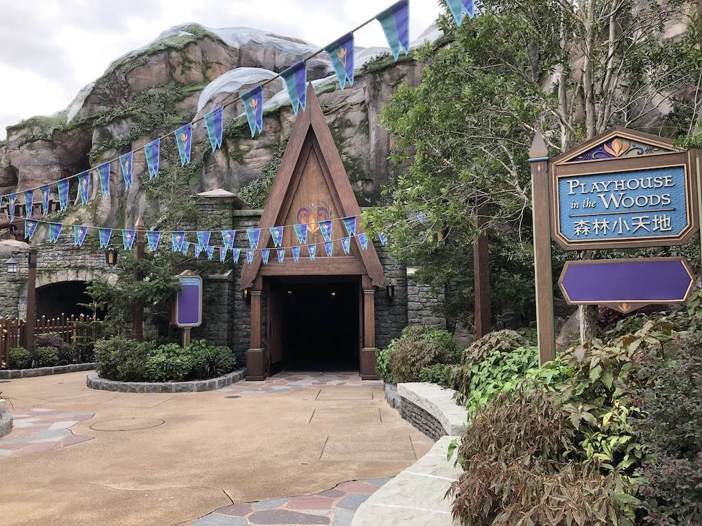 Playhouse in the Woods is a live, interactive, show that’s the first of its kind at Hong Kong Disneyland. The idea is that this is a special place where Elsa and Anna used to come and play and now as adults, they’re entertaining their new friends by sharing something from their childhood. The show is somewhat akin to Enchanted Tales with Belle at Magic Kingdom in Walt Disney World, but does not feature the same walk-through element (you know the effect I mean). Guests enter a large room with a stage at the back wall and plenty of space to wander around.