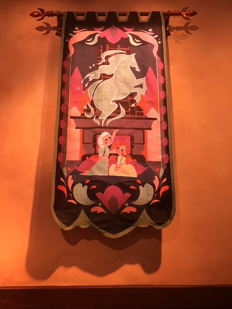 There’s also a display only staircase leading up the “inn" decorated with paintings of the royal family and a giant Arendelle Crest featuring Elsa and Anna’s portraits.
