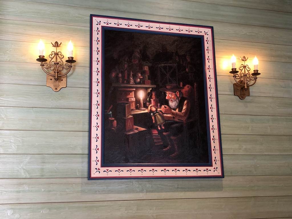 The decor in the restaurant includes a variety of interesting paintings showcasing ships, sea monsters, Arendelle, sailors like General Mattais, and dozens of nicknacks displayed on high shelves along the walls.