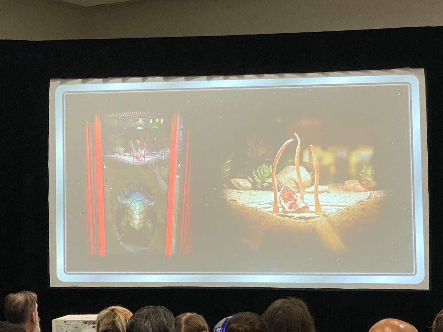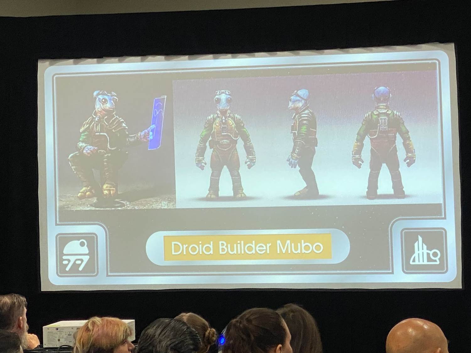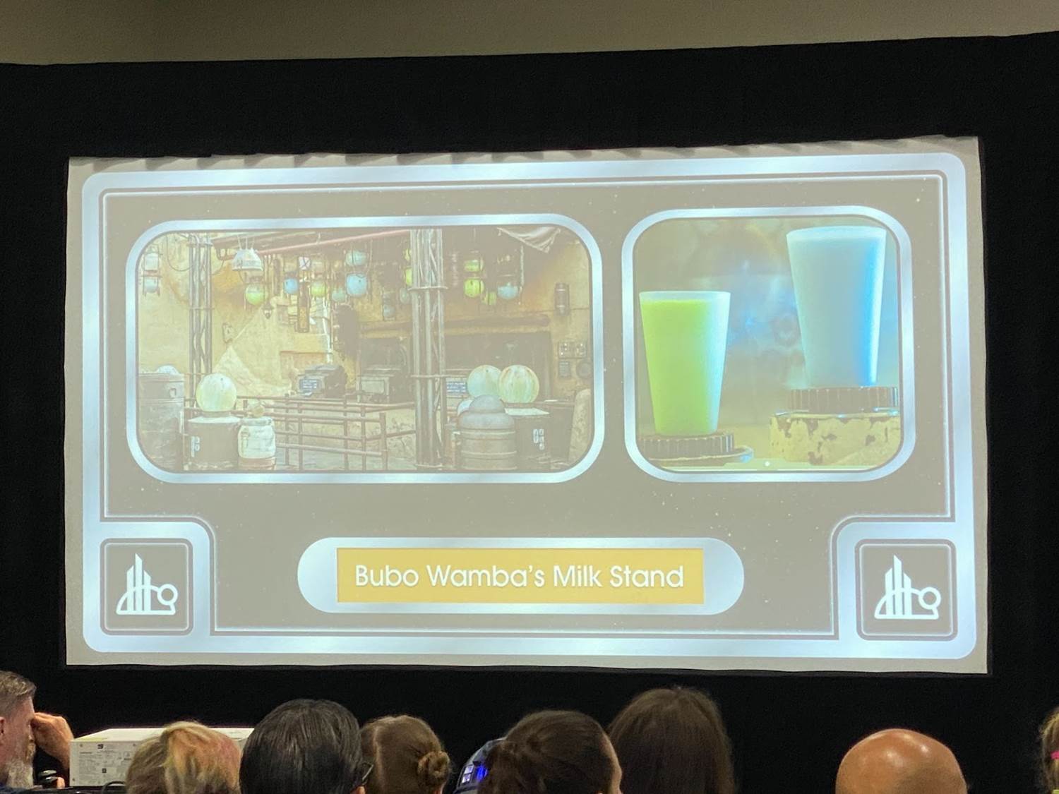 The Kyber crystals in Savi’s Workshop come from Tarkin Initiative crates, and we also learned about the Trilon Wishing Tree, Oga’s Cantina, and its owner Oga Garra. Then the panel took a poll in the room and Blue Milk definitely won out over Green Milk from Bubo Wamba’s Milk Stand.