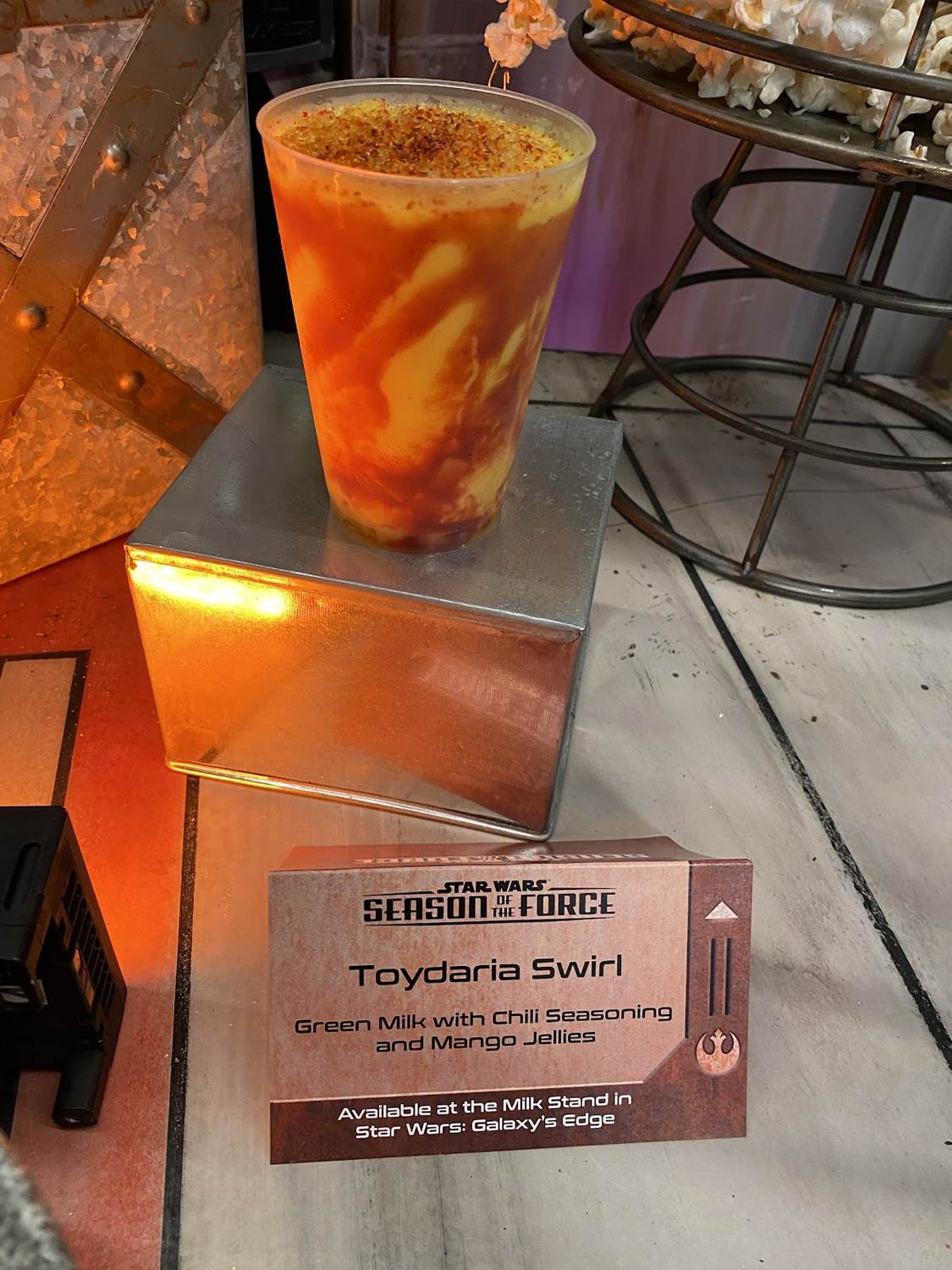 - Toydaria Swirl: Green Milk with chili seasoning and mango jellies