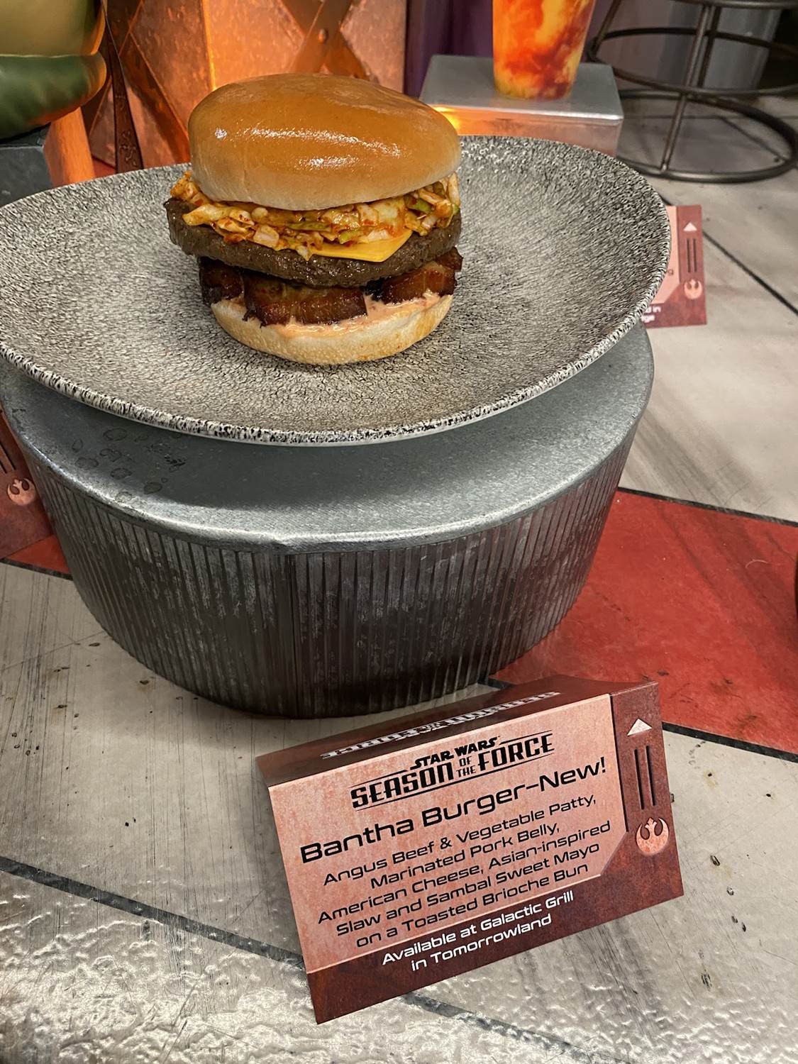 - Bantha Burger: Angus beef and vegetable patty, marinated pork belly, American cheese, Asian-inspired slaw, and sambal sweet mayo on a toasted brioche bun (New)