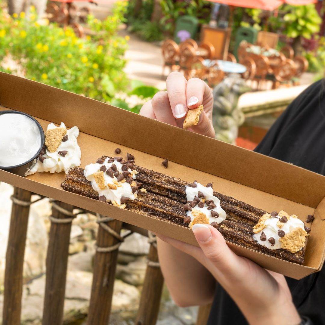 - S’mores Churro: Churro rolled in a mixture of chocolate dust, sugar, and salt, topped with whipped cream sprinkled with graham crackers and mini semi-sweet chocolate chips. Served with whipped cream and marshmallow topping – available at Eight Spoon Café
