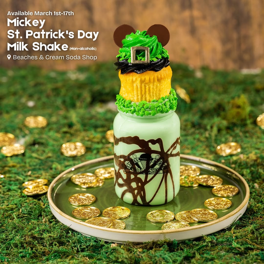 - Mickey St. Patrick's Day Milk Shake: Mint milk shake with chocolate drizzle, shamrock sprinkles, and a specialty vanilla cupcake – available March 1st-17th at Beaches & Cream Soda Shop at Disney’s Beach Club Resort