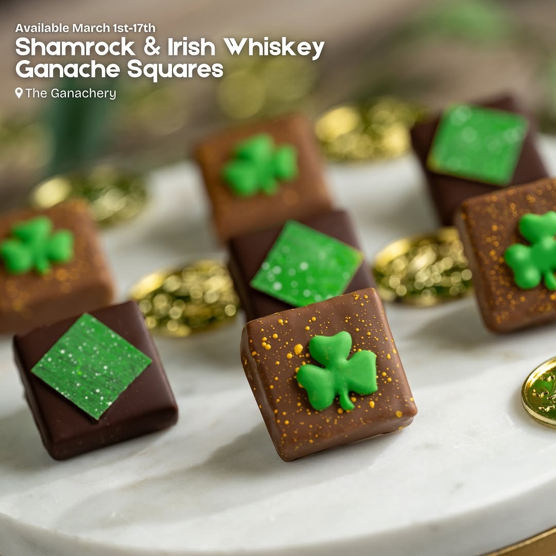- Shamrock Ganache Square: Irish cream whiskey square covered in milk chocolate