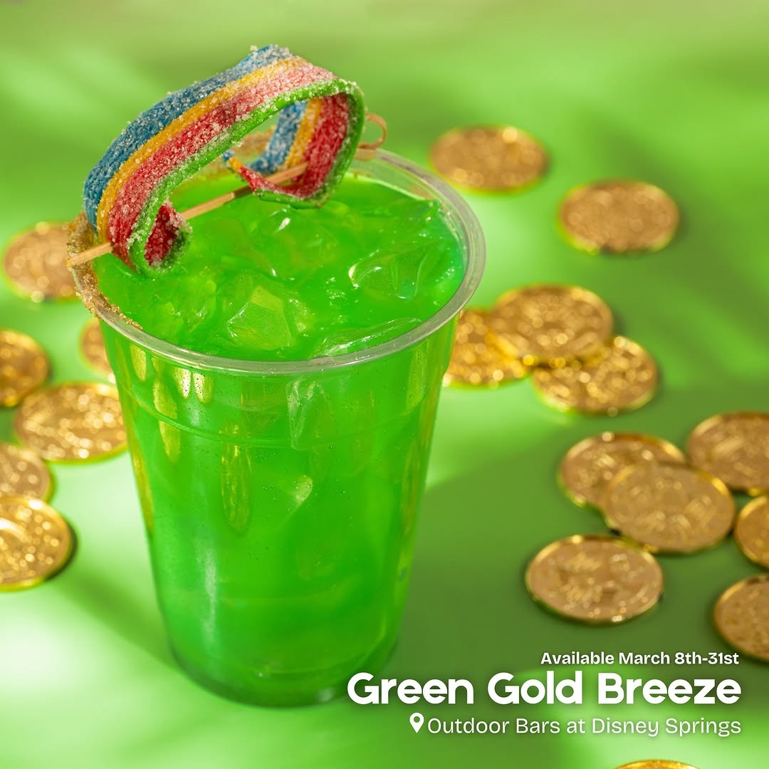 - Green Gold Breeze: Bacardí Silver Rum, Bols Blue Curaçao Liqueur, DOLE Pineapple Juice, Minute Maid Orange Juice, lime juice, and a candy garnish – available March 8th-31st at Disney Springs Outdoor Bars