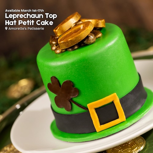 - Leprechaun Top Hat Petit Cake: Irish toffee cake, butterscotch whiskey ganache, dark chocolate mousse, and caramel crispy pearls – available March 1st-17th at Amorette’s Patisserie in Disney Springs