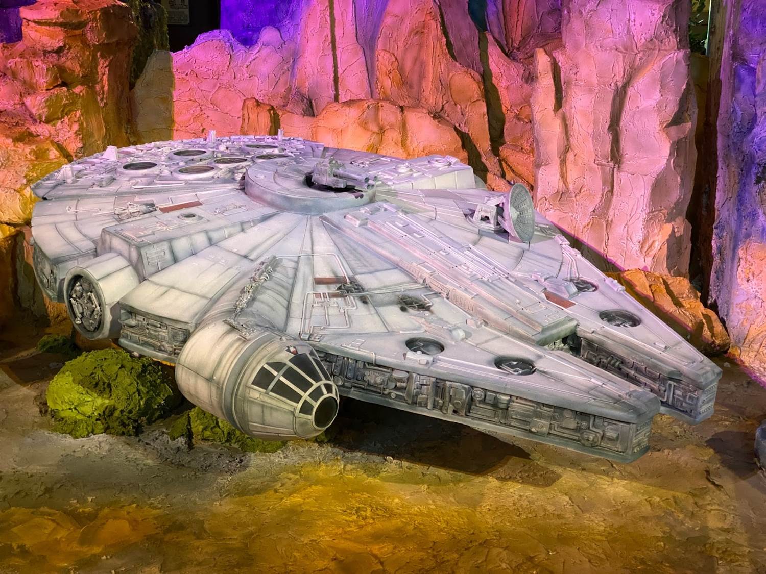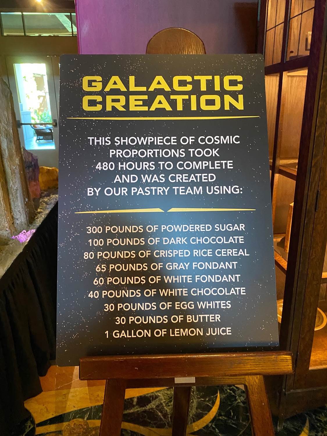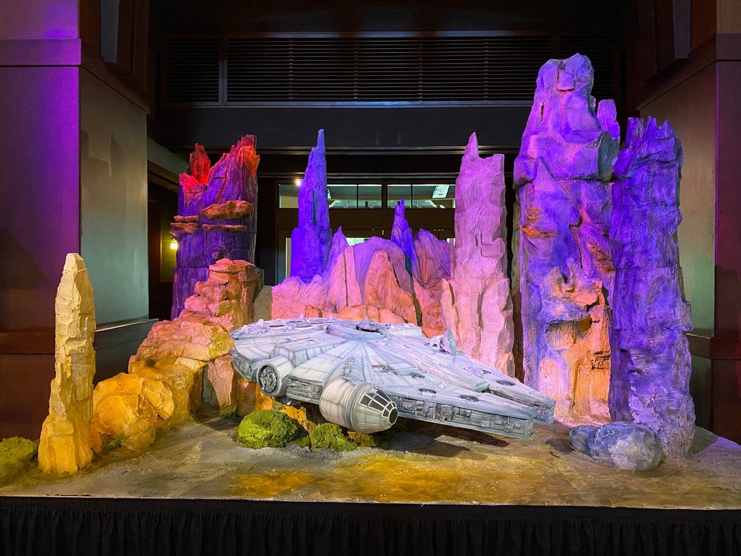 This showpiece depicting the Millennium Falcon arriving in Black Spire Outpost was created by Disney’s Culinary Team. The figure contains edible ingredients, like 300 pounds of powdered sugar, 80 pounds of crisped rice cereal, 60 pounds of marshmallows, 100 pounds of dark chocolate, and more.