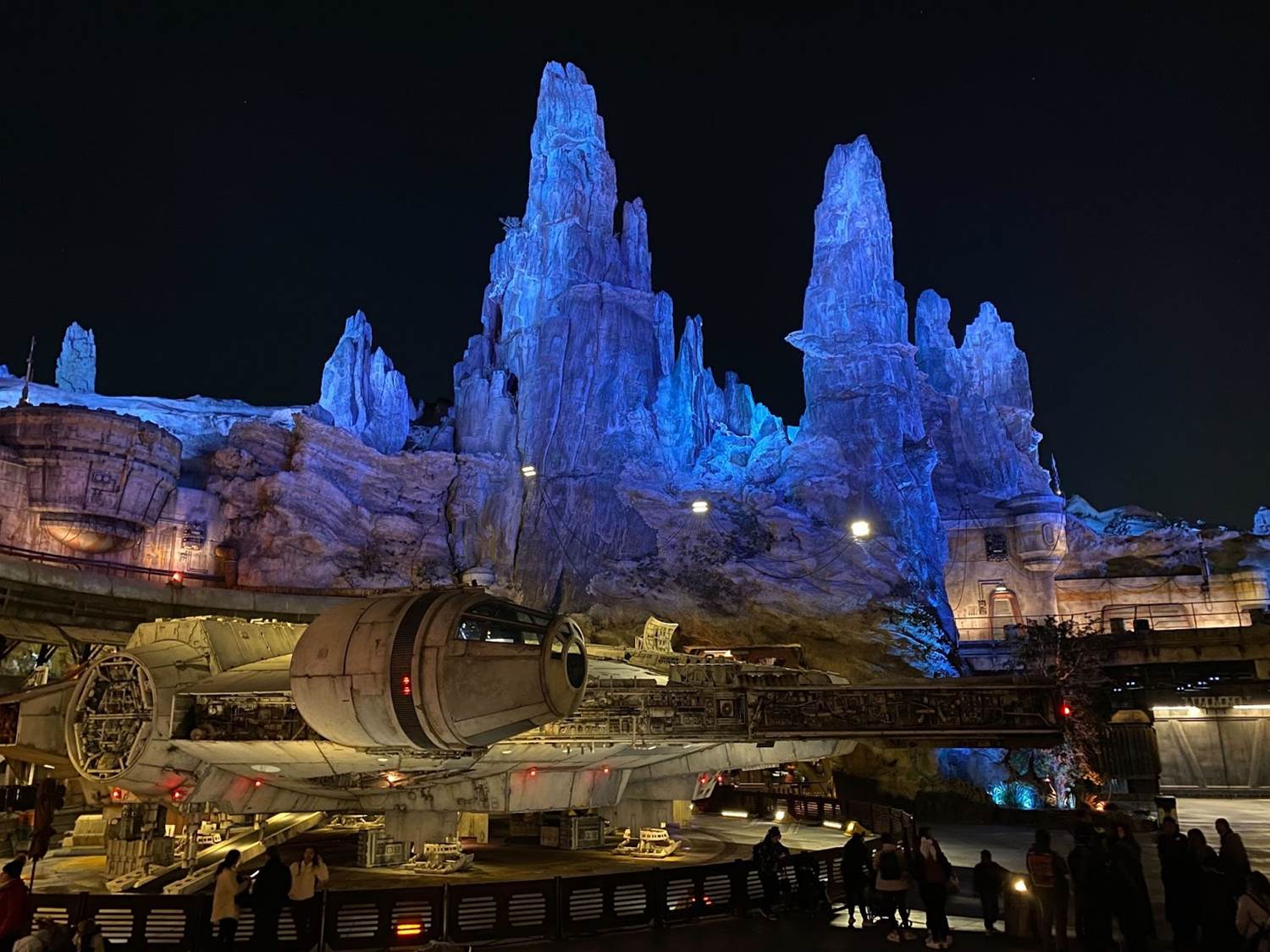Update 4/10: Yesterday afternoon I drove back down to Disneyland Resort and camped out for a few hours on the tiered balcony in front of Docking Bay 7 to finally watch “Fire of the Rising Moons" in Star Wars: Galaxy’s Edge. I enjoyed the show quite a bit more than I thought I would (considering I’m not much of a fireworks guy either) but I do have a couple of minor notes. The first is that I definitely appreciated how well the music synced up with the pyrotechnic elements from Disneyland’s “Wondrous Journeys" nighttime spectacular, but this did clearly require the creative team behind the show to make some edits to the John Williams music we all know and love– like the “Asteroid Field" track from The Empire Strikes Back (one of my favorites, which I’m very glad was heavily featured). These edits work in the moment to keep the timing right, but they will jump out to anyone like me who has heard this music enough throughout their lifetimes that they have it memorized to the note. The other thing that I would consider a major issue and needs to be rectified by Disneyland as soon as possible is the constant, loud hissing noise emanating from the Millennium Falcon docked there in the Black Spire Outpost spaceport. You can hear it clear as day throughout the embedded video below, and it really detracts from the score being played over the loudspeakers. Those reservations aside, I really did think the show works as a night-capper on Batuu, and Star Wars: Galaxy’s Edge will likely become my go-to location to enjoy the Disneyland fireworks whenever I’m at the park for my own enjoyment. I’m just hoping maybe someone from Disney Parks entertainment will read this and turn down the hissing during the performance.