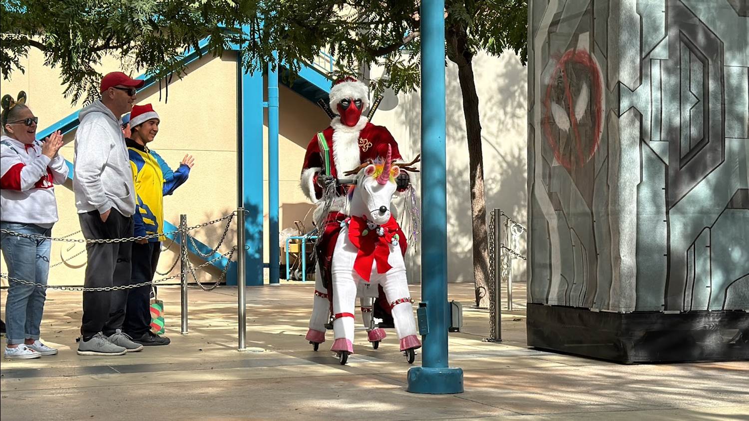 Deadpool dresses up as Santa Claus, giving a festive twist to the Disney California Adventure show.