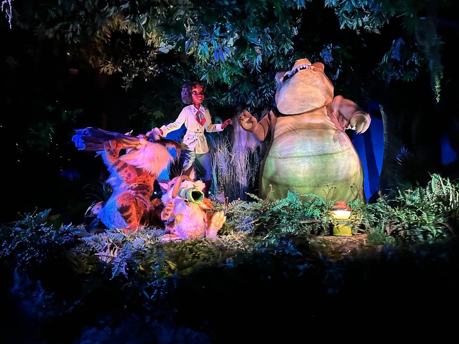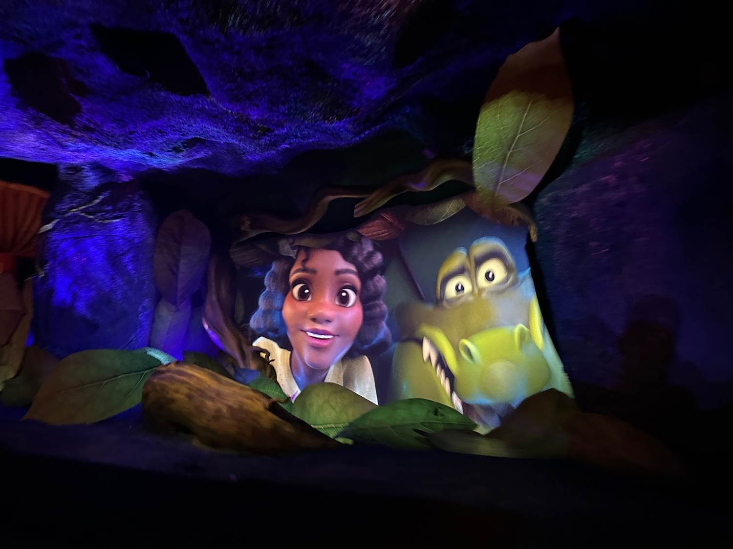 If you’ve read other reviews, you’ll know a common complaint is the ride has dead spots where nothing is really happening. Honestly, while riding it, even with that knowledge in my head, I did not find that to be the case. There are spots where there are no figures as you transition from one scene to another, but my mind was always occupied with greenery and fireflies. It didn’t feel dead to me. However, what I did notice is how some scenes seem to be timed to trigger when the boat passes as opposed to being a scene on repeat as you glide by. I distinctly remember once coming upon a scene with Tiana where she’s more or less standing still doing nothing until our boat got much closer, then her scene triggered. It seemed noticeable and odd and took me out of the moment. Perhaps, this is related to how early we rode and will be rectified in the future (if it hasn't already).